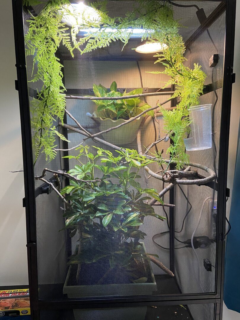 As of now my female is going to be moved to her permanent home- a 2x2x4 Reptibreeze. I am setting it up with a Schefflera in the center and some Pothos hanging from the side. I will be adding more plants to increase the foliage cover so she can hide to her heart's content. I got some branches from the trees in my backyard and cleaned those a few days ago. They'll be perfect for the setup once I install the dragon strand ledges I have.