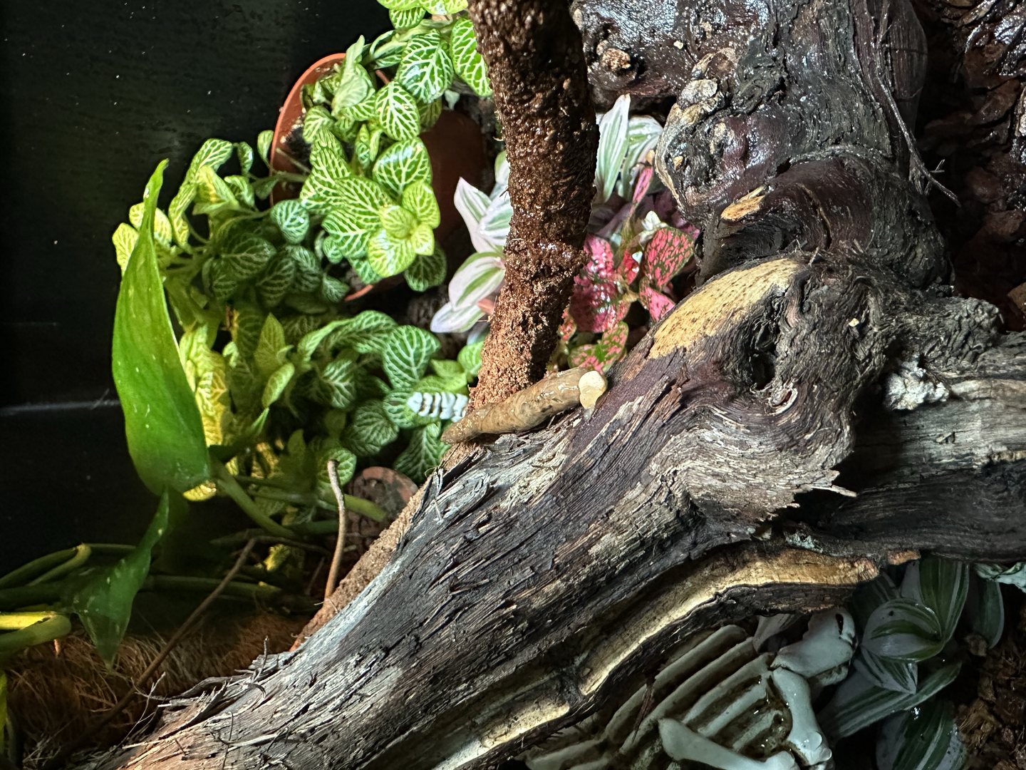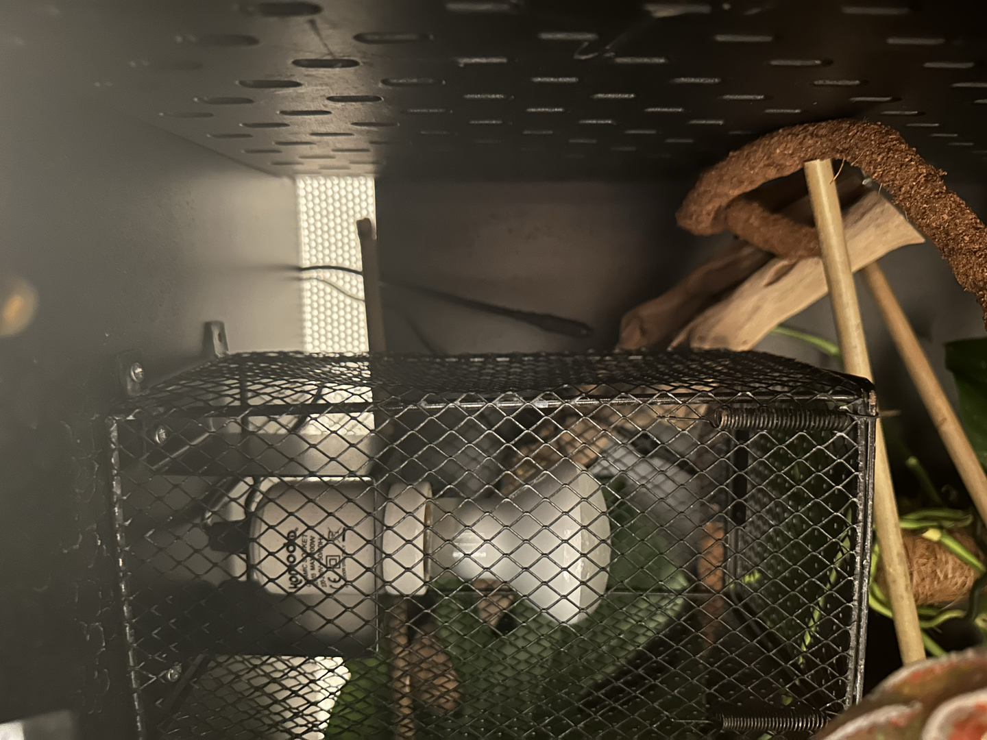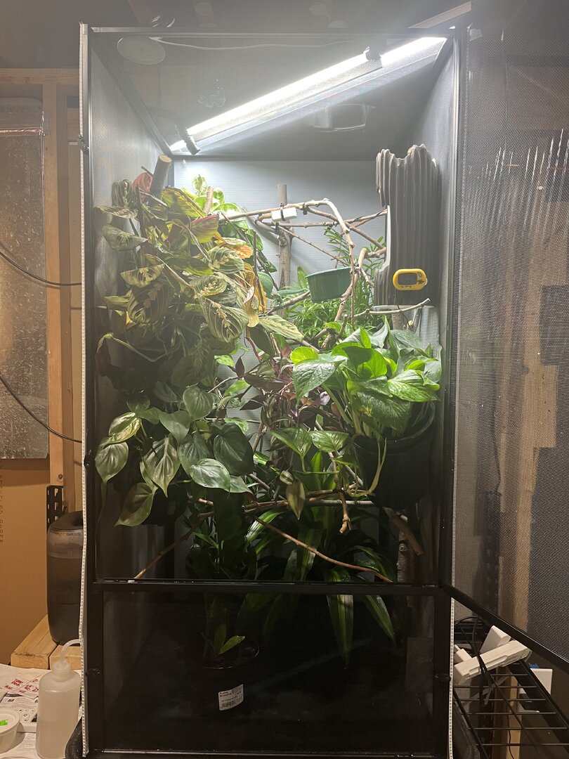 5.Plants :Yes. The live plants in there include, a pot of epipremnum aureum, a pot of monstera deliciosa, and some short plants that I don't really know the names. t is worth mentioning that I laid Orchid Bark Fine at the bottom of the cage. I also laid some Hydro Rocks at the very bottom of the cager to prevent mold and water accumulation. Additionally, I have Springtails and woodlice on the bottom to prevent mold.