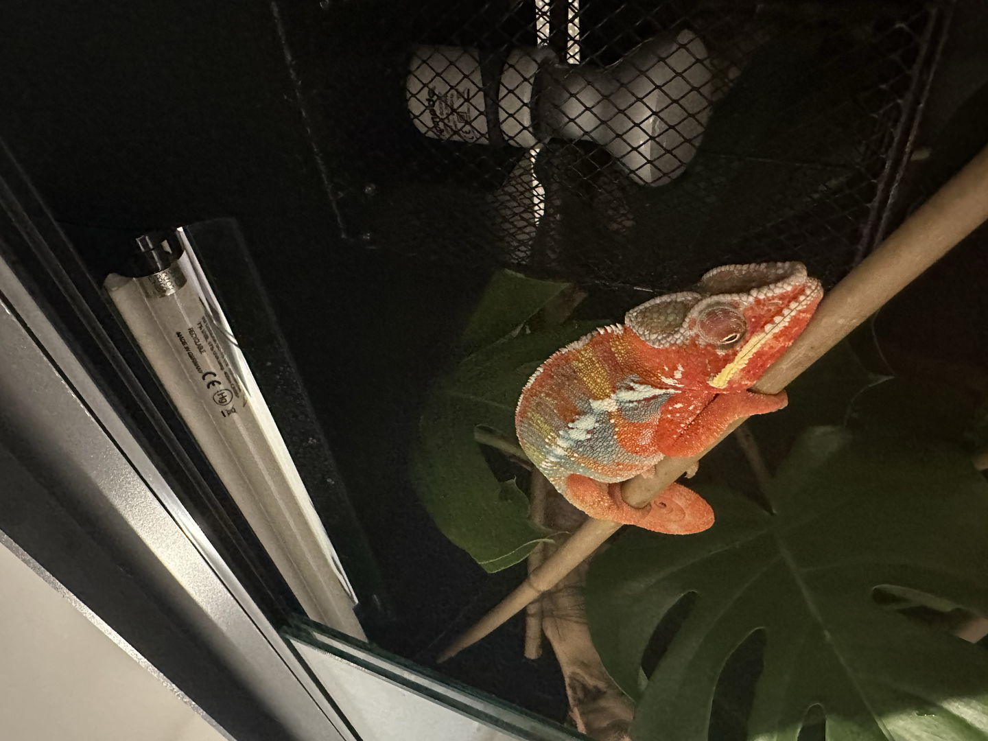 1.Your Chameleon: Panther Chameleon, Ambilobe, male, six months old, 20-25cm long, I've just got him for nine days