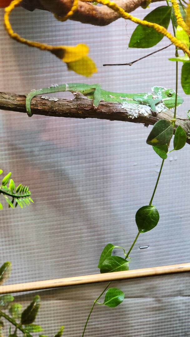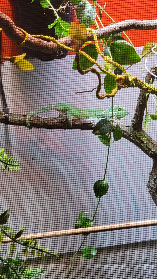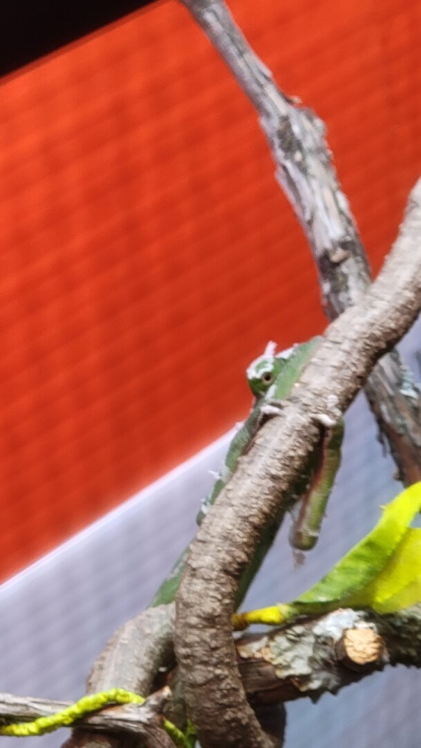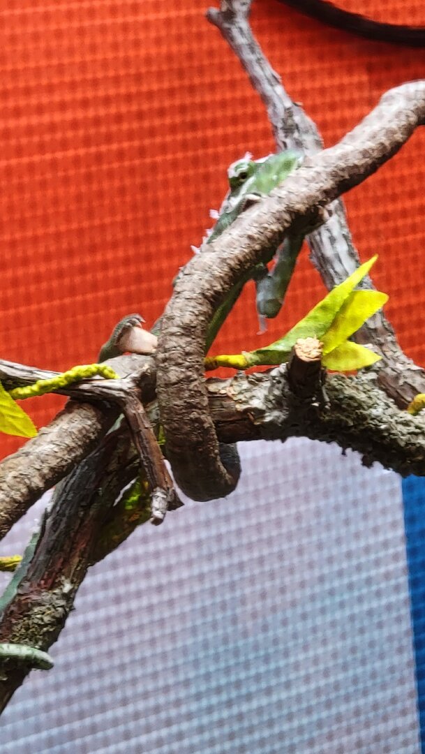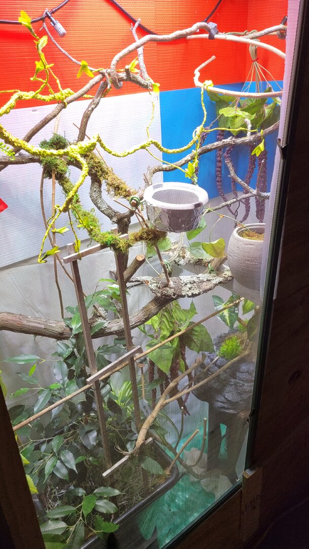 I took her out of her encloser to clean and add a better light. After finishing the encloser I tried grabbing her and she fell on the ground. I then added her to her new encloser, and she fell again. She has been very afraid of me after this, and her eating habits have slowed down. She is shedding right now and the last two days she has been hanging above my light. I have a ZooMed light with T5 and LED. I built and encloser that is 3 feet in length 2 feet depth and 5ft height. The light hangs inside the enclosure. She was eating out of my hands and now I cannot seem to get her to eat. I have mealworms, crickets and Dubia roaches. I am trying to stop feeding her crickets and want her to eat the Dubia roaches. She seems to prefer crickets. She seems skinny right now also. Her poops are brown with some white. more brown than white. I have a mist system set to go off every 4 hrs. with 10 sec mist and a self-watering plant dripper. She does come out and move around the cage just hides when someone comes by. Pictures added.