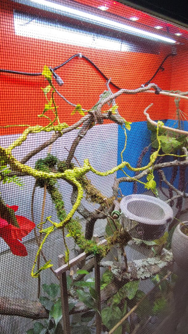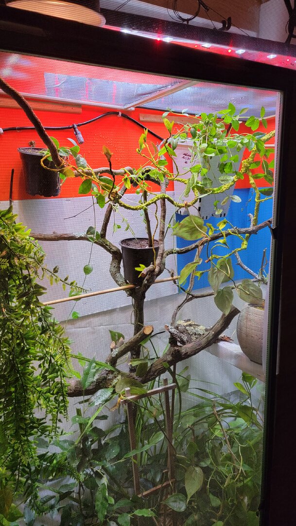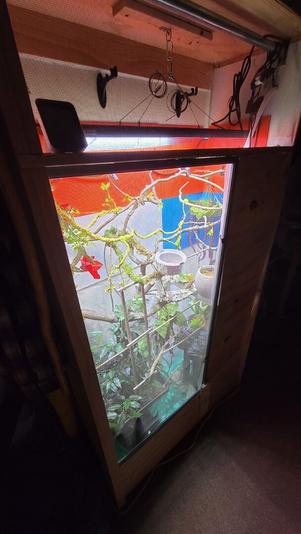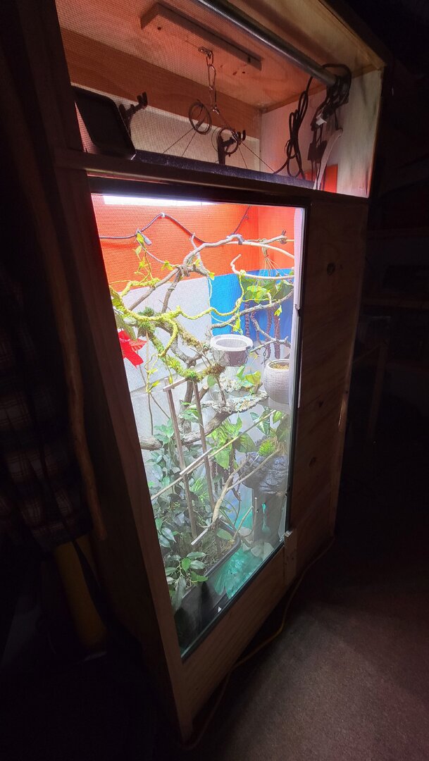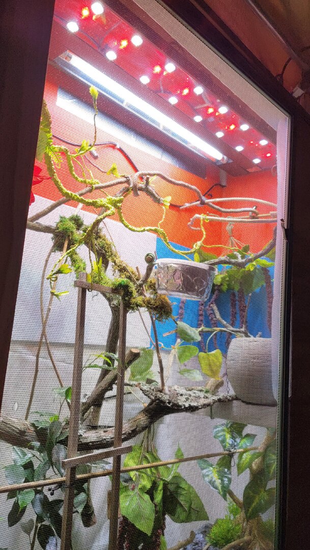 I purchased a screen cage at first but decided to make her a bigger encloser, I painted the entire closet with Kitz then wrapped it in plastic, I had them plastic panels that I added just to add more insulation. I thought I just purchased black, but the color pack came instead. Hopefully that will take care of mold. I am a little nervous now that you said that about mold behind everything. I added a basking light and a screen between the lights. I put in soil and sand mixture at the bottom after I layered another layer of plastic. I planted the trees right in that. I added some plants up higher, but it will take some time to fill in. I think I am happy with it but let's see if Ell likes it.