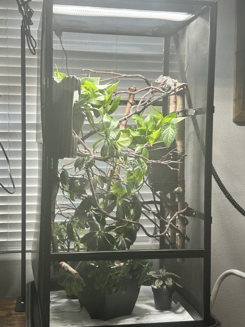 - Cage Type - Describe your cage (Glass, Screen, Combo?) What are the dimensions? XL Retibreeze just moved in last weekend. The back is covered with Window shrink wrap and the left side is covered with Black Coroplast so he can’t see our Panther.