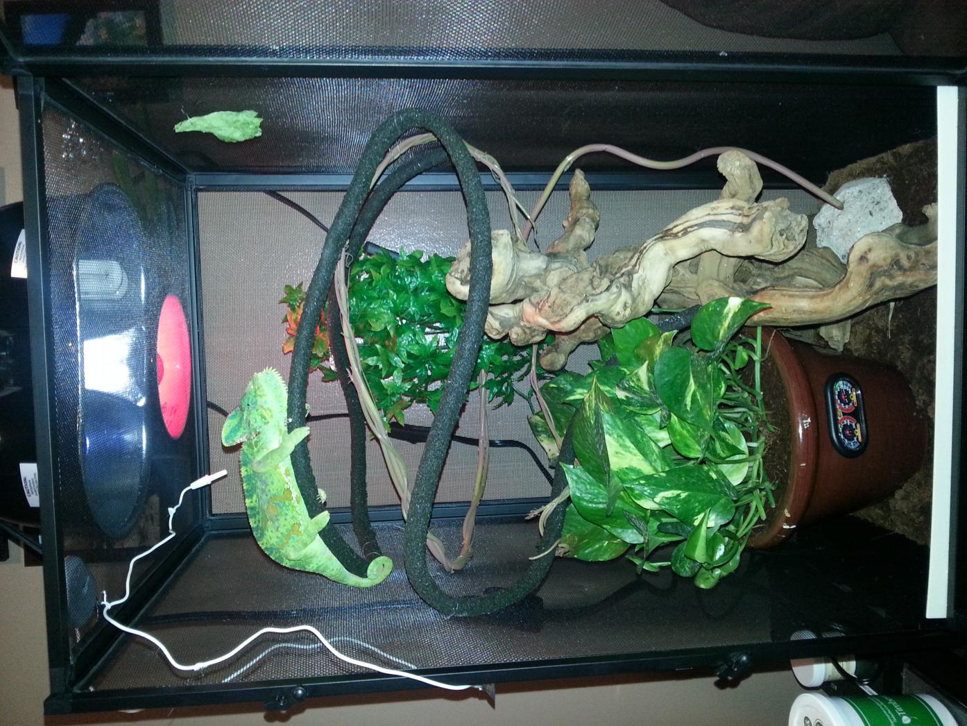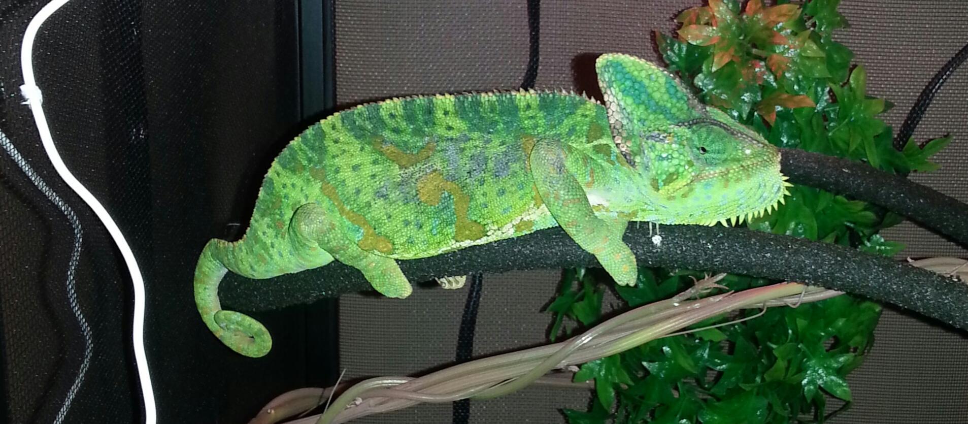 I got a one year old veiled chameleon two days ago. She has been at my local pet store for 3 months and has been very happy and healthy there. Since we brought her home and got her cage set up she hasn't moved. She sits in one spot on her vine. She was very active at the store. I have 2 vines in there, a wood climbing branch, a fake plant and a potted plant. She won't eat or drink and if we walk over to her cage she hisses at us, leans away and puffs up. I know she needs to to adjust to her new place, my concern is that she's not moving around the cage and every once in a while she makes a strange noise and lifts her head up towards the ceiling. If I had to describe it it's kind of like a squeaky cough. I don't see any drainage or mucus in her mouth, eyes or nose. I'm just really worried and don't know how long to let it go. Is she just stressed with the New surroundings. We have her in the living room.