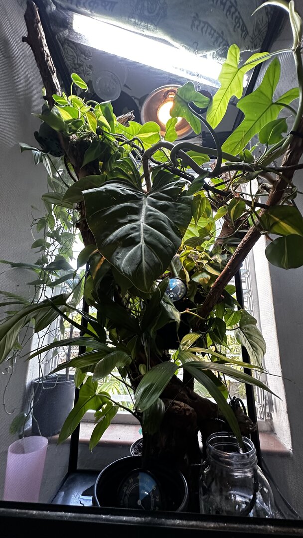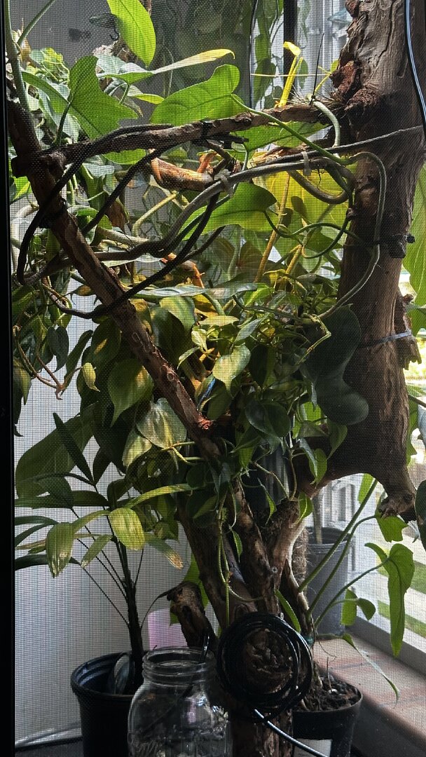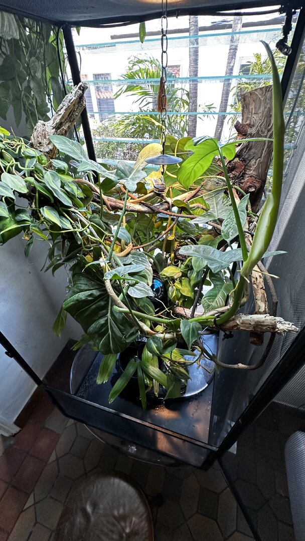 Hydration. I mist and drip, reddit tells me I’m an absolute idiot because I should be offering water from a glass in his cage. Bill from Cham Academy says it’s less natural and misting and fogging and dripping are best. His poops are very normal and he’s big and juicy and doesn’t show hydration issues, but what is the ideal option here. Reddit trolls say misting can cause problems or over humidifying or this and that and I have way too much incoming information to be able to decide for myself. The tree he lives on is completely and easily removable from his cage, it’s one big piece with plants growing on the actually branches, so I can easily clean everything thoroughly weekly.