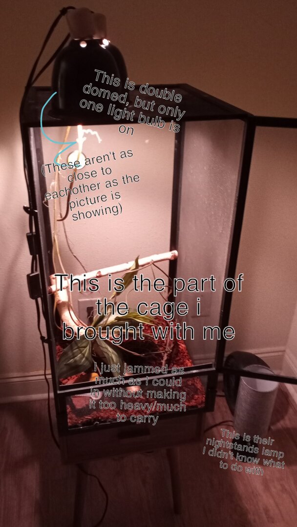 I'm taking care of an old woman this weekend and staying at her house for money and will be home Monday, but I took him with me. His cage is screen on all sides except the bottom. I haven't fed him anything new or out of the ordinary lately, but temps did drop in my house this past month, it's been difficult keeping his enclosure above 75 when it's usually around 80 at the top of it. He usually stays outside of his cage in our room, but now he refuses to leave it.