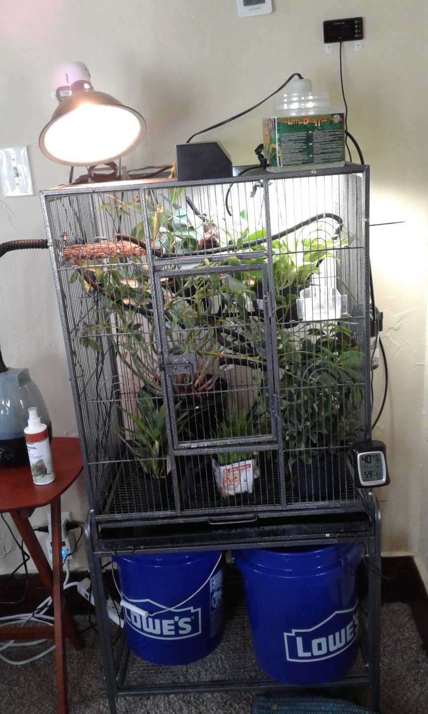 • Cage Type - Larger parakeet cage as it was a last minute fix due to failing at building a cage. I figured allows for airflow and is water proof so why not....about 2 feet tall and 2 1/2 wide.
