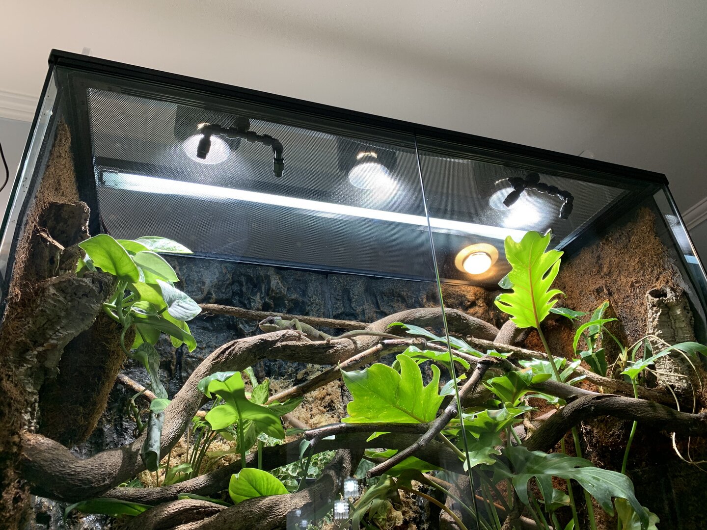 Sounds good. Thank you for the feedback. I know those t5 bulbs can suck up some power so the idea of using LED for the visible light really appeals to me. I know the enclosure I purchased (which hasn't arrived yet) comes with some sort of ambient led lights, but I'm sure it's not nearly enough to handle the growth of live plants in my basement rec room where the new addition will be living. Looks like I will be building a custom hood to house the lighting to keep things tidy. I'm assuming my best bet is to mount it directly to the top of the enclosure to get the t5 as close to the top as possible correct? I would love to suspend it a few inches above if possible.....