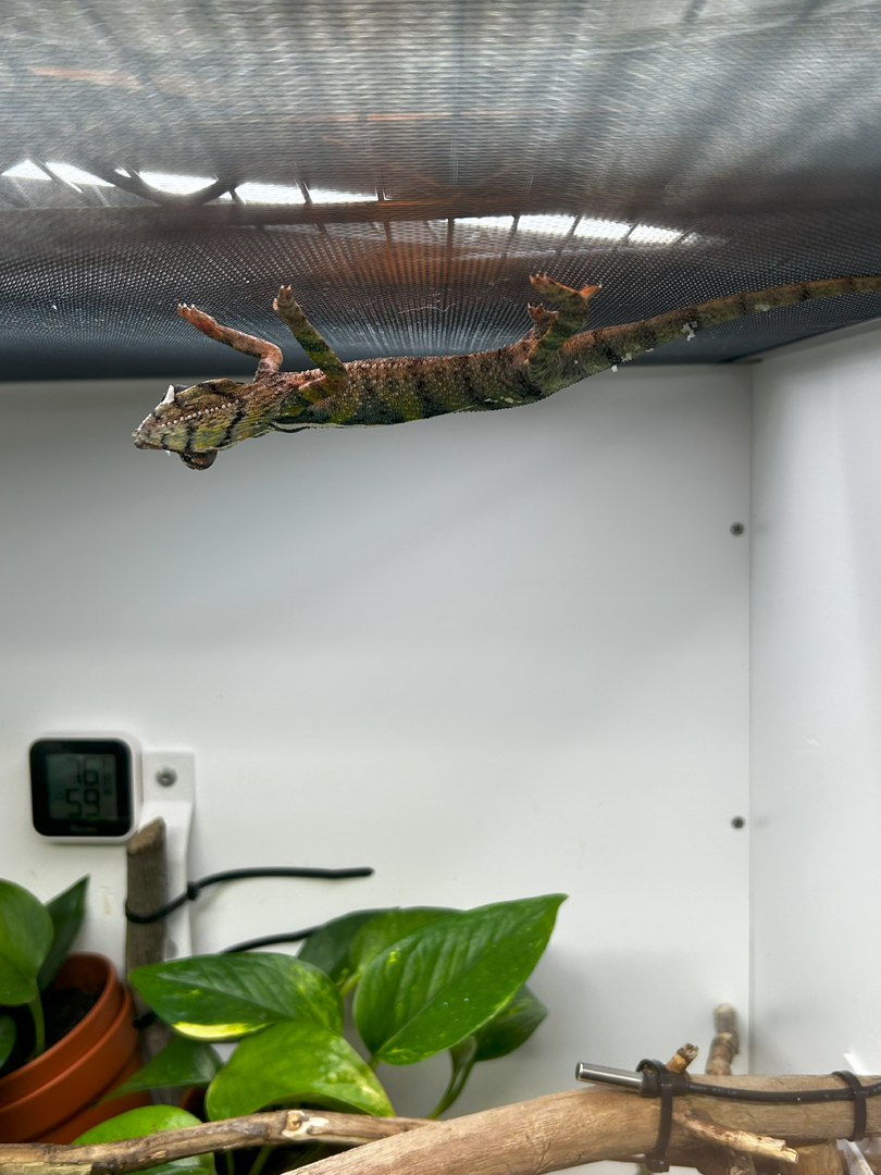 That’s that NICE set up!! Curious, what are you using to track your humidity and temperature on the graph?Hello, today is the second day that I have had my chameleon. I have noticed that he is constantly getting on the top screen.