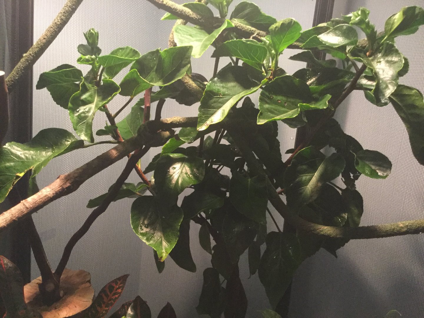 Plants include: Hibiscus, Croton, and Pothos Bine.