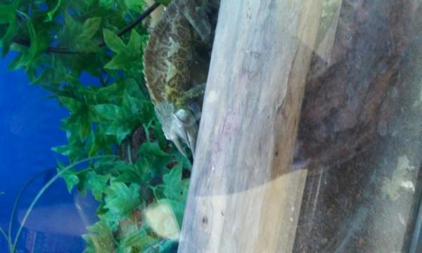 Here is a picture that was from about a month ago. The plants you see in the background were the only plants in there, and its just right behind him.. it looks like a lot, but it really isn't.. they are not very strong fake plants either.. just a hanging decoration or filler from what I can tell. The wood is the piece that goes from side to side in the tank.. the other side of the tank has nothing but that wood going through it..