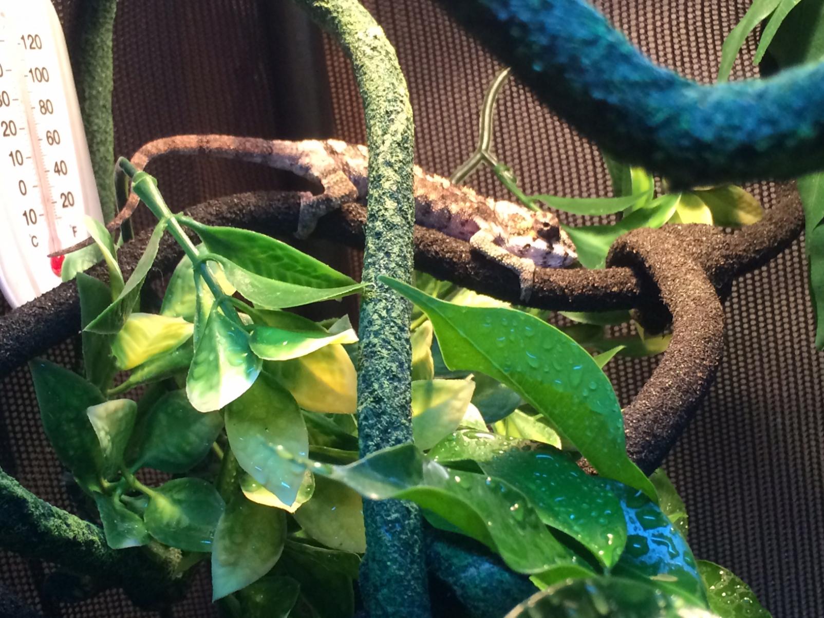 The other thing is his mood colors. I'm familiar with the colors of veiled chameleons (basking, stressed, excited, etc.) but Ambrose's panther colors are confusing to me. Should he be colorful when basking, or do they make themselves darker with the thin bars? (Like in the third photo.) What should I be wary of?