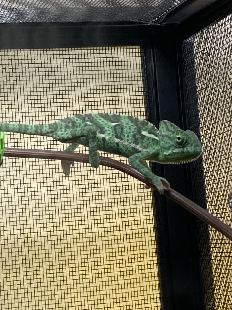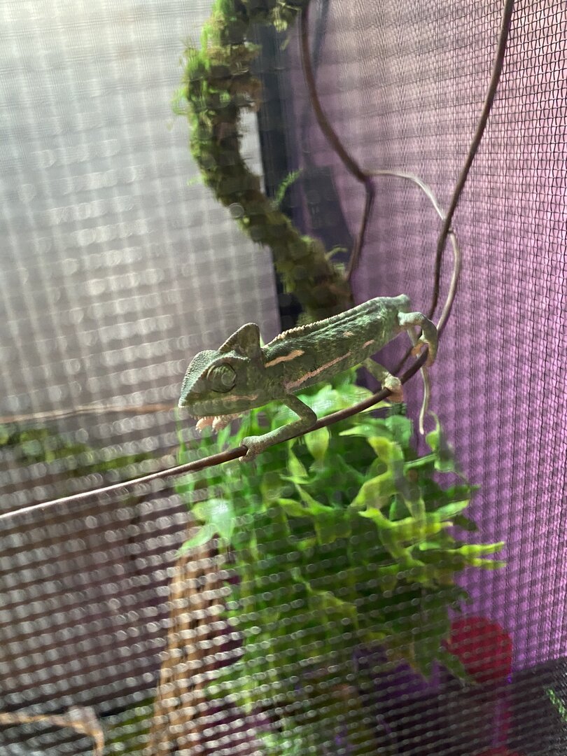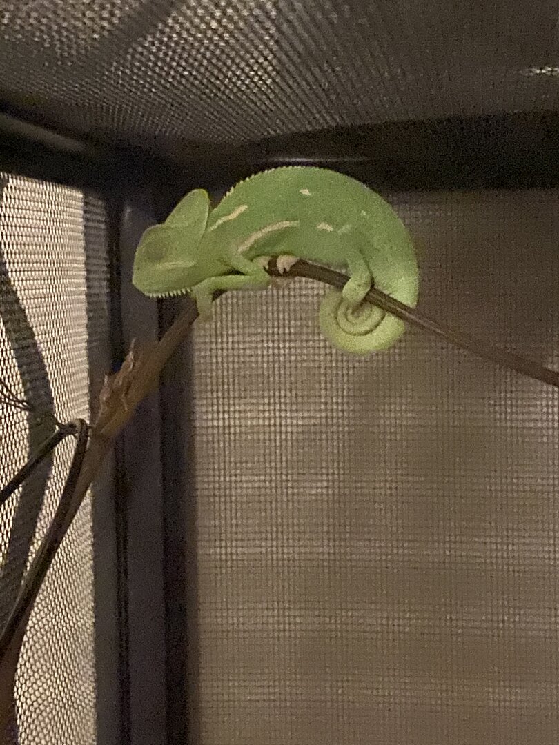 - Your Chameleon – baby female, about as long as my finger, we think female based on lack of wrist knuckle the internet says means male, veiled Cham. Had 3 days