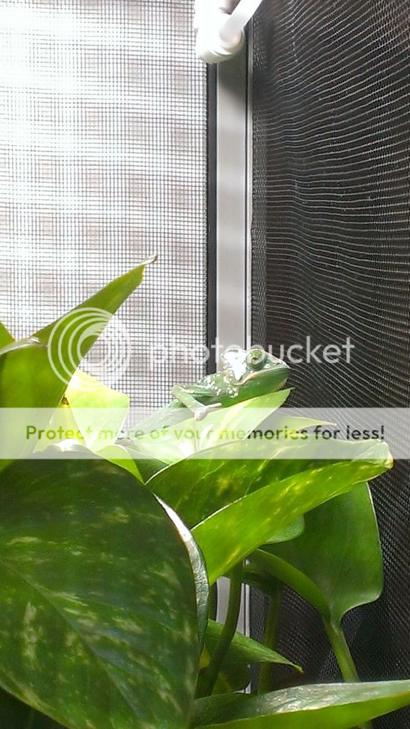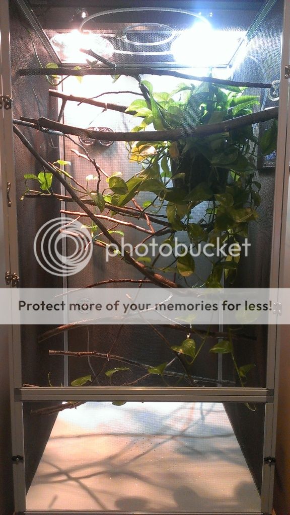 Sorry, back on track. He's been eating (calcium w/o D3) dusted crickets, drinking and spends a lot of time basking under the heat bulb. He does roam around his cage every so often. Here is a photo of his 2'x2'x4' DIYcages cage: