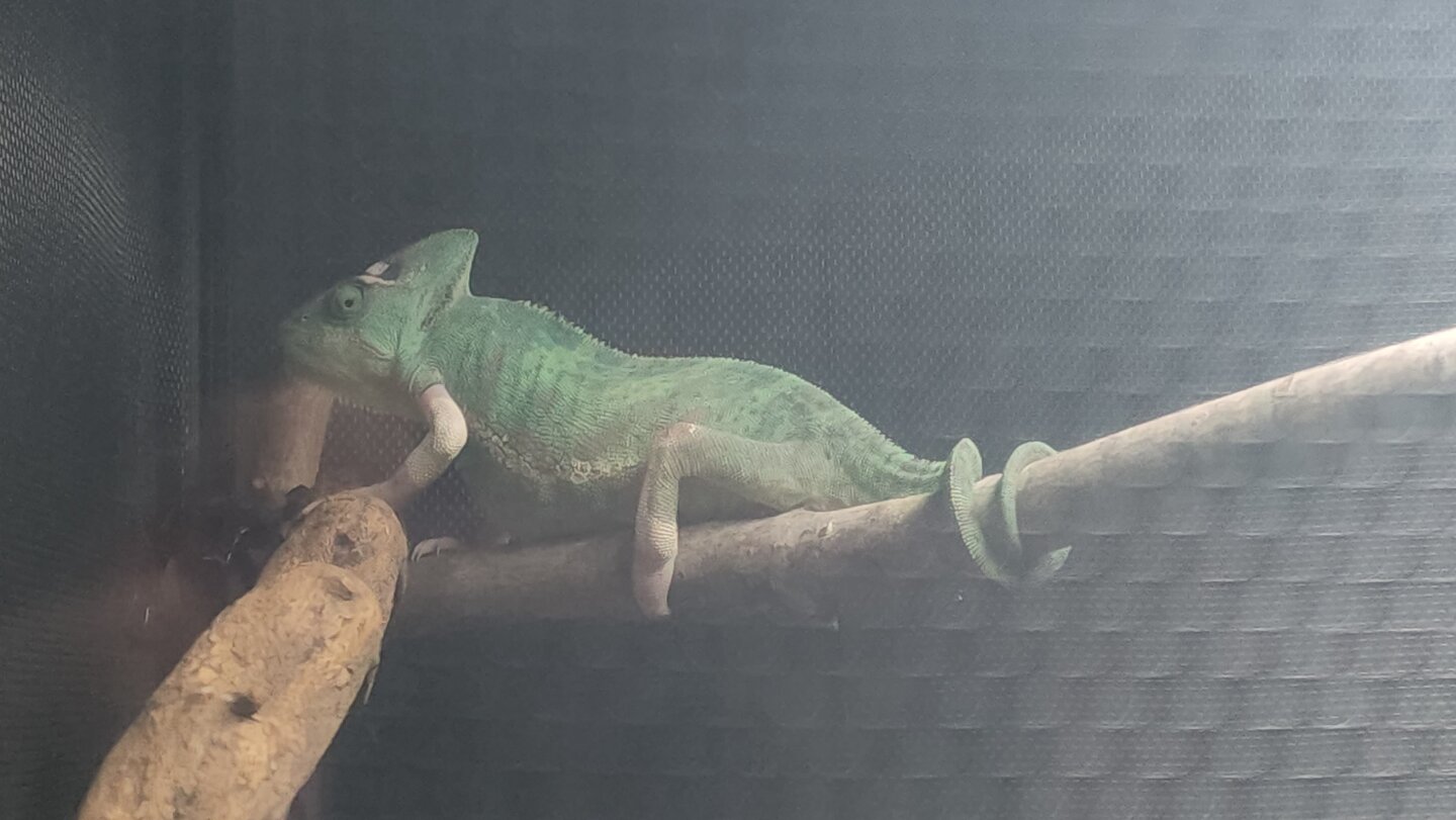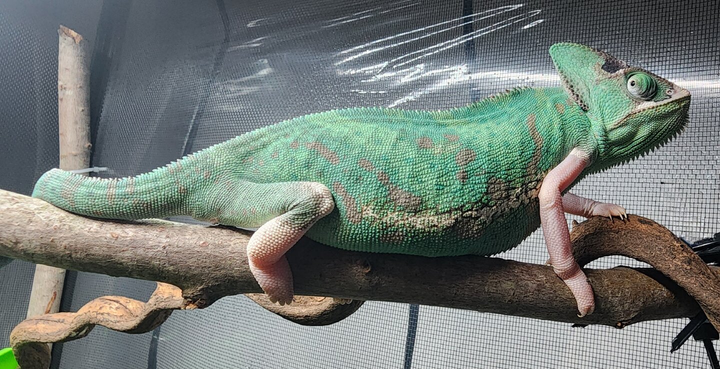 When I got her they said she was roughly 8 months old. Elmina is very sweet and wants to be handled. She will come right to the door when you try to feed her and climb right on to you. When you go to put her back it she will sit on her branch by the door and paw at it. She has an amazing personality which blows my mind because my last veiled did not want any interaction at all.( Her name was Neme, short for nemesis because you couldn't even walk by without her hissing or opening her mouth towards you.)