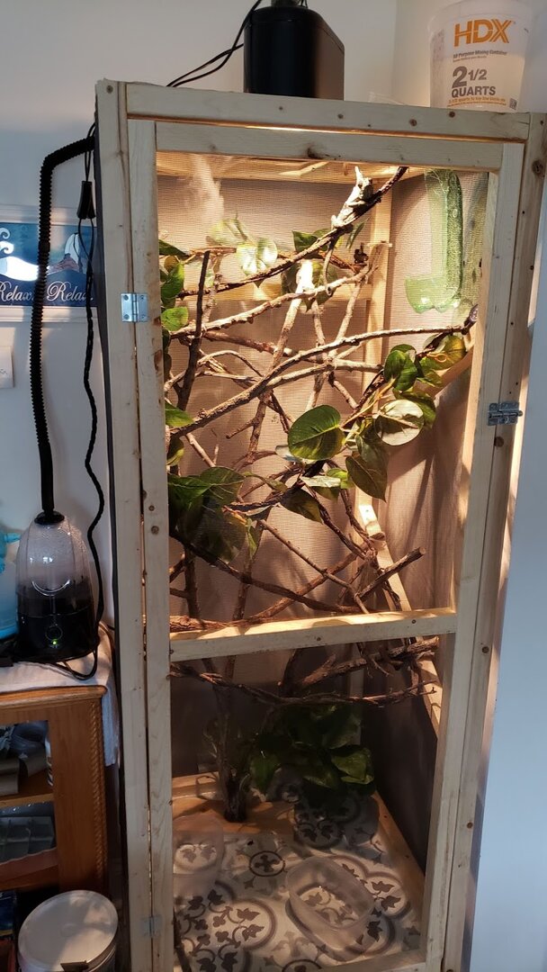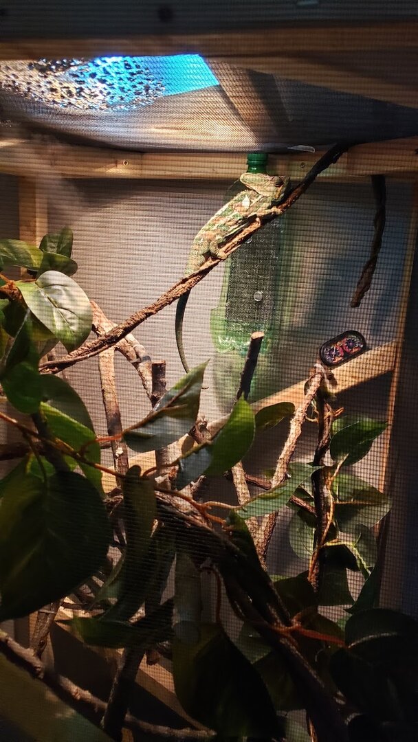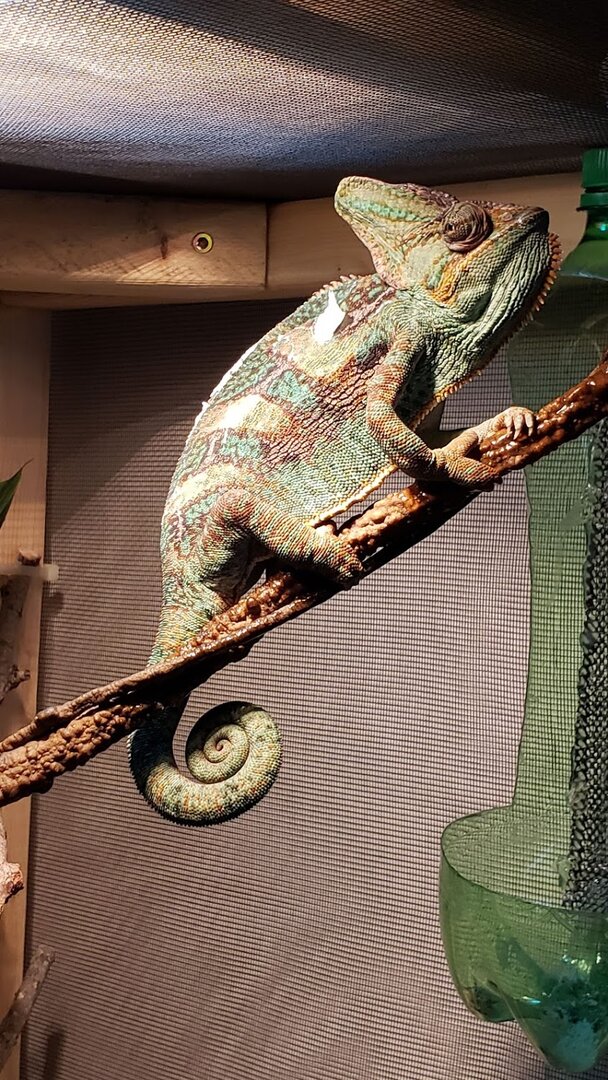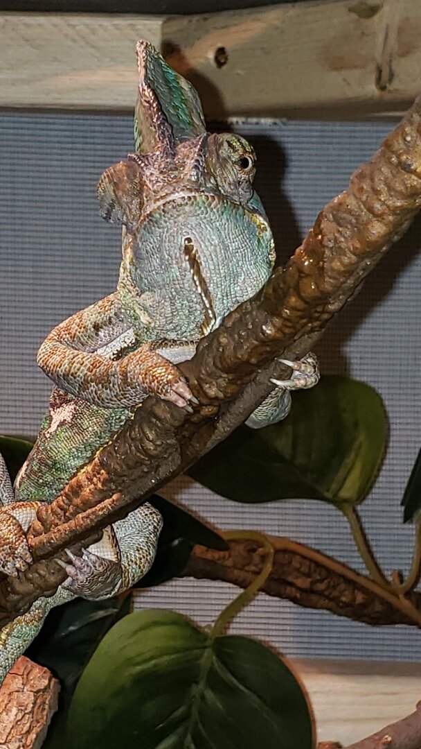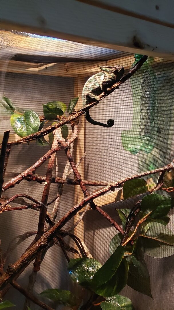 So, when I was younger in high school, I took care of a chameleon that was my science teacher's. The chameleon (named Chameleo) was very friendly and I truly enjoyed caring for him over long breaks in school. I've always wanted another one but just kind of brushed it off since I have kiddos now. This is going to sound bad and some of you may be turned off by it but during this Covid stuff, I had commented on a friend's post and she informed me that there was a male veiled chameleon in the juvenile/adult stage that had just been surrendered. After contacting the place, I decided this might just be the right time so I started building an enclosure and brushing up on all of my chameleon knowledge. I had to wait a month to get him anyways before his quarantine time was up. Now, that I have him, I love him. Although, I felt like the one I cared for in high school was easier. His enclosure was already together and he was very social. My little Rosco (who I have had for coming up on 3 weeks now) is a cranky little thing. Lol. Being an animal lover, I know that not all animals are the same and they come with all different kinds of personalities. I also know that it takes time for chameleons to trust since we humans look like a predator. I'm wondering if it will take longer for him since he has been shuffled around? He eats great. He eats about 6 to 7 large crickets a day and he loves horn worms (though I am currently out of those right now. I have ordered more). I have a fogger (that collects water on the screen and drips down) and a dripper in his enclosure and I mist his enclosure twice a day. When I mist, he freaks out like crazy. I do not spray him directly. I have the knob turned to a fine mist and most of the time spray on the screen above so water will drip down in case he doesn't get to the water in time. I even use spring water in his fogger and the a gallon of water that sits out, open, all day and night before I use it (so the chemicals with dissipate from the water, so I've read). I find that he sits on this one branch constantly. He very rarely moves around and he is very protective of his branch which I fully respect. I just want to make sure he isn't getting dehydrated. The lady who took him said that he ran from her when she misted and she was always worried that he wasn't getting enough to eat and was also in 1 of 2 places in his enclosure there just like he is here. He seems to really like his enclosure. I built it tall because I know that they like feeling high up. I just want to make sure I am doing right by him even though he is a little mister cranky pants. Lol. Any suggestions for me? Last time I gave him a shower, it did NOT go well. He has his own hibiscus bush that we brought inside and put in our bathtub and put him in the bush. I had already had the shower going and water temp good, when I put him in and after about 15 minutes, he tried to escape and almost fell out of the pot. Thank goodness I was right there watching the whole time. I'm not sure if I should do that with him now or not. I honestly am nervous to because it was such a traumatic event the first time, I would hate for either one of us to have to go through that again, as stupid as that sounds. He is pooping well, with his urates not super white but not even close to orange and a pellet at the end. I'm wondering if I may be stressing him out by wanting to make sure everything is perfect and I need to just give him several weeks to adjust. I have only had him out 3 times and the longer he seems to be here, the more cranky and aggressive he becomes. I can only imagine what he has been through and I am sure is not very trusting as it sounds like the gentleman who had him in the first place, did not work with him and then ended up giving him up. That is all I know about his past.