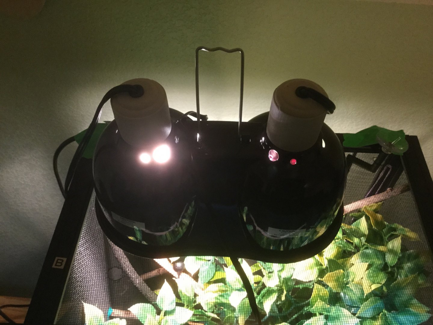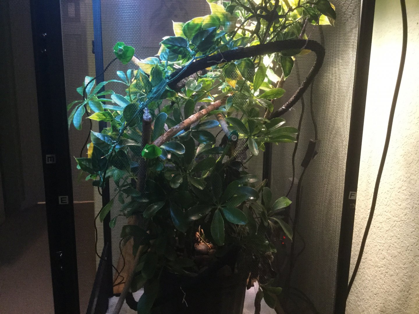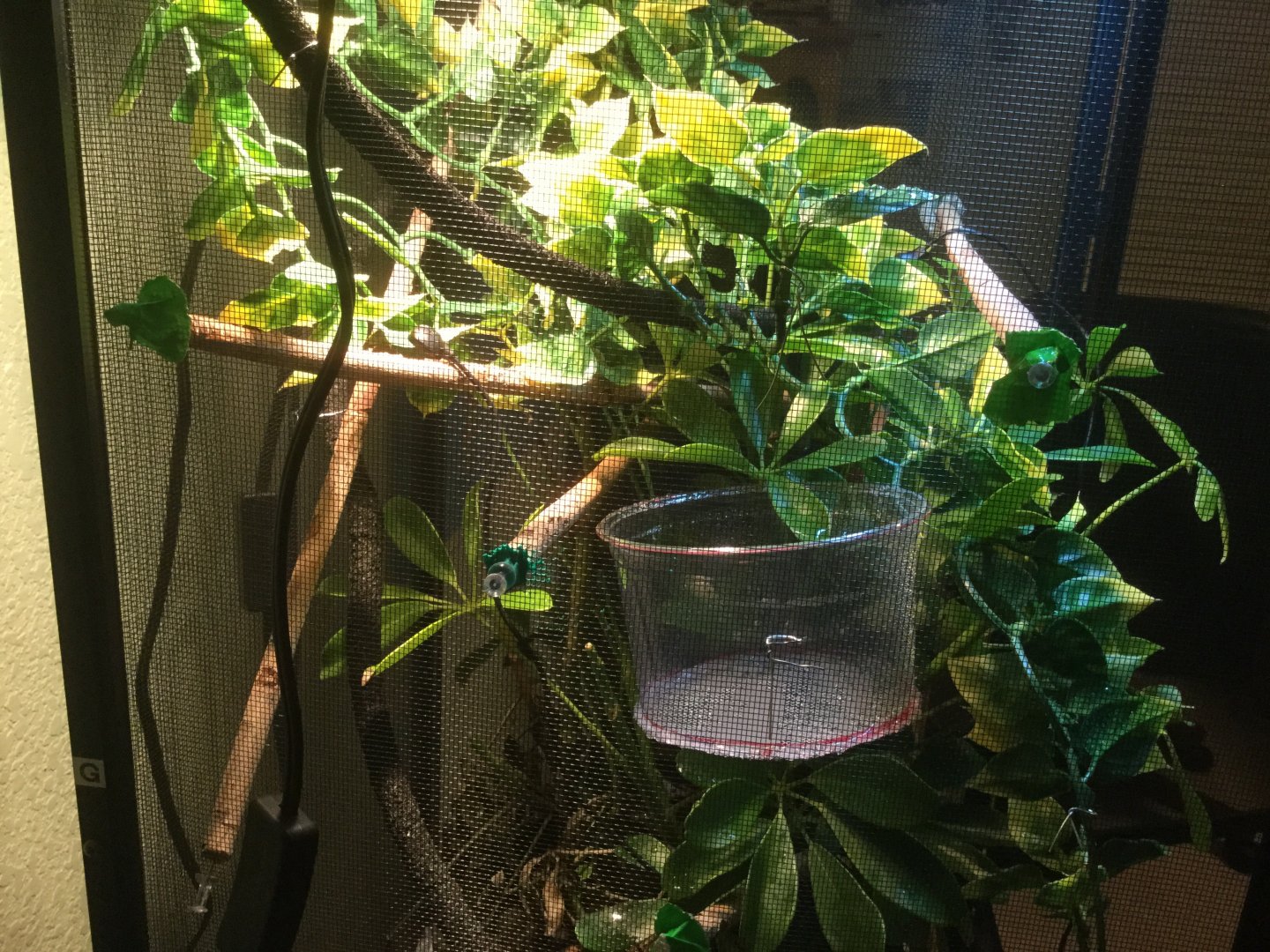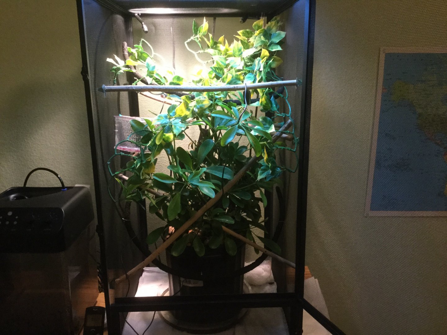 View attachment 145916 View attachment 145917 View attachment 145918 View attachment 145919 Hi everybody! I just wanted to get an opinion on my cage for my new Panther chameleon(I'm getting him in December). I have a Repti-Breeze cage that is 16"x16"x30" and a live small umbrella plant. I have a multitude of sticks that I have cut, sanded, and treated for parasites plus a vine. I have a Repti-Sun 5.0 UVB strip bulb, a 75 watt basking bulb, and a nighttime heat bulb so he can stay warm when it gets cold in the winter, just in case(I live in Colorado). Please, don't be afraid of sharing anything you might think is negative. Any feed back is appreciated! Thanks!