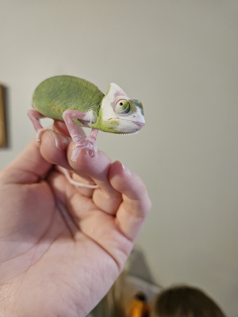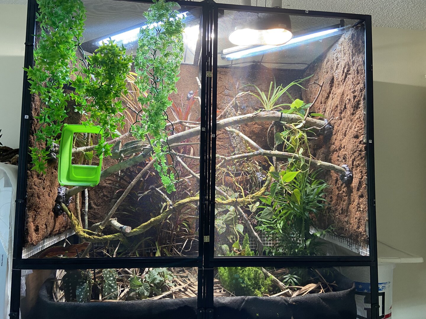 Hello everyone! I am a new chameleon owner. I have some tank set up questions. I live in NH, my house is extremely dry so I am currently doing a 3sided glass tank with a screen front to upkeep humidity. Overnight I get it between 80-100%, during the day between 45-65% (this will be more stable and more in the 40-50% range once I reposition our fan!). Heat up top is 82 degrees.