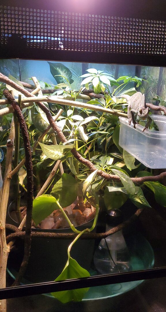 made a big mistake and had fake moss caught his butt eating it 3 days after I got him and immediately removed the one vine he seems to have passed it though thank god. Did eat a cricket outta my fingers a few days ago but still super timid. He dosenst flee to the back of the terrarium now when I open the door to feed or mist so thats a good sign i hope. Work scedule from 6 am to 5 pm and wife works just as long so he has alot of uninterrupted time with no movement 5 days a week. Very bright green when he wakes up too so beautiful. Moved his vines around noticed he was rubbing his crest on the screen attached a picture of his home as well and if I need to make adjustments let me know