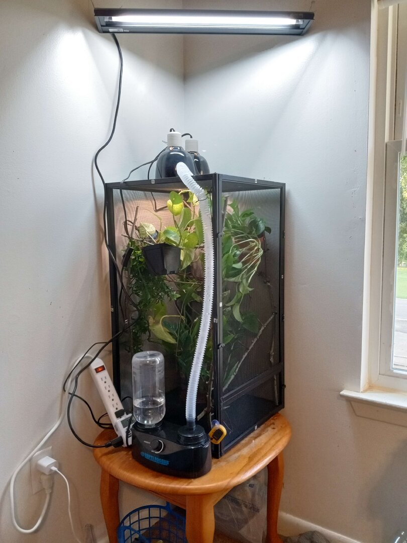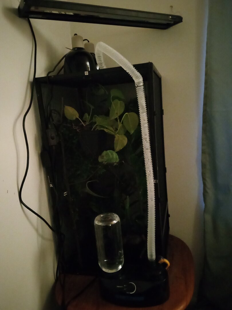I hand mist for one minute right after his lights turn off, and for one minute, 30 minutes before his lights come on. ( Will get the mist king when we get his 2X2x4 enclosure in about 3 weeks. ) He is not a fan of the misting. he absolutely hates it.