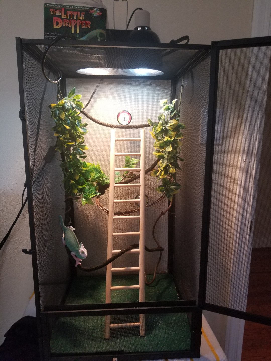 - Watering - i have a dripper set up that runs all day. Water is treated with Reptisafe. I mist her cage 2-3 times a day depending on humidity for about a minute and a half or so. I see her drink occasionally but not always.