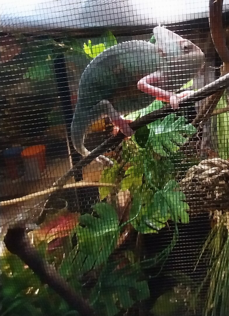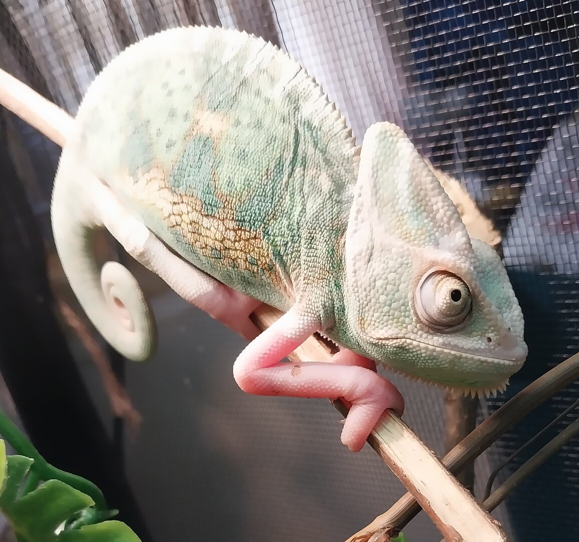 Oops meant to say tip of the tailHi Winnie MJ is a translucent veiled chameleon. Translucent is an albino gene other than the coloring I don’t think there are any differences. I am in agreement that those are tarsal spurs on the rear feet. So you don’t have to worry about a lay bin or egg binding etc. much better. He is ready to shed again. When you see that light colored sheen in pics you can really tell. That is totally normal. When they are young like he is they tend to shed their entire body real fast. That changes once full grown. Then sections will molt. The only thing you need to watch for with molting is that shed at the top of the tail molts. If it doesn’t it can cut off the circulation and kill the top of the tail. Also stuck shed around ankles can cut off circulation too. If you see this assisting is necessary. Other than that, they are dry shedders and don’t need assistance by pulling it off for them. I personally like to blow it off their eyes so they don’t rub the eyes on branches which can cause injury when it impedes the vision. But that’s just my personal preference it’s not a must. Love the cage set up and you definitely need grow lights for your plants. Just make sure your heat is not concentrated. Keep the basking light perch away from the plant lights. Also whatever his tongue hits may end up down the gullet. So make sure there is no perlite or small rocks on top of the soil of your plants. I actually sift my top soil. And change it every year. Part of my spring cleaning. Crazy I know. But it works!