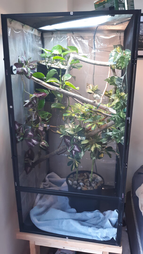 - Humidity - Based on the digital hygrometer, humidity during the day stays between 37-45%, night time is 75% after misting and usually around 55% by morning. I have shower curtain lining the back and left sides of the cage.