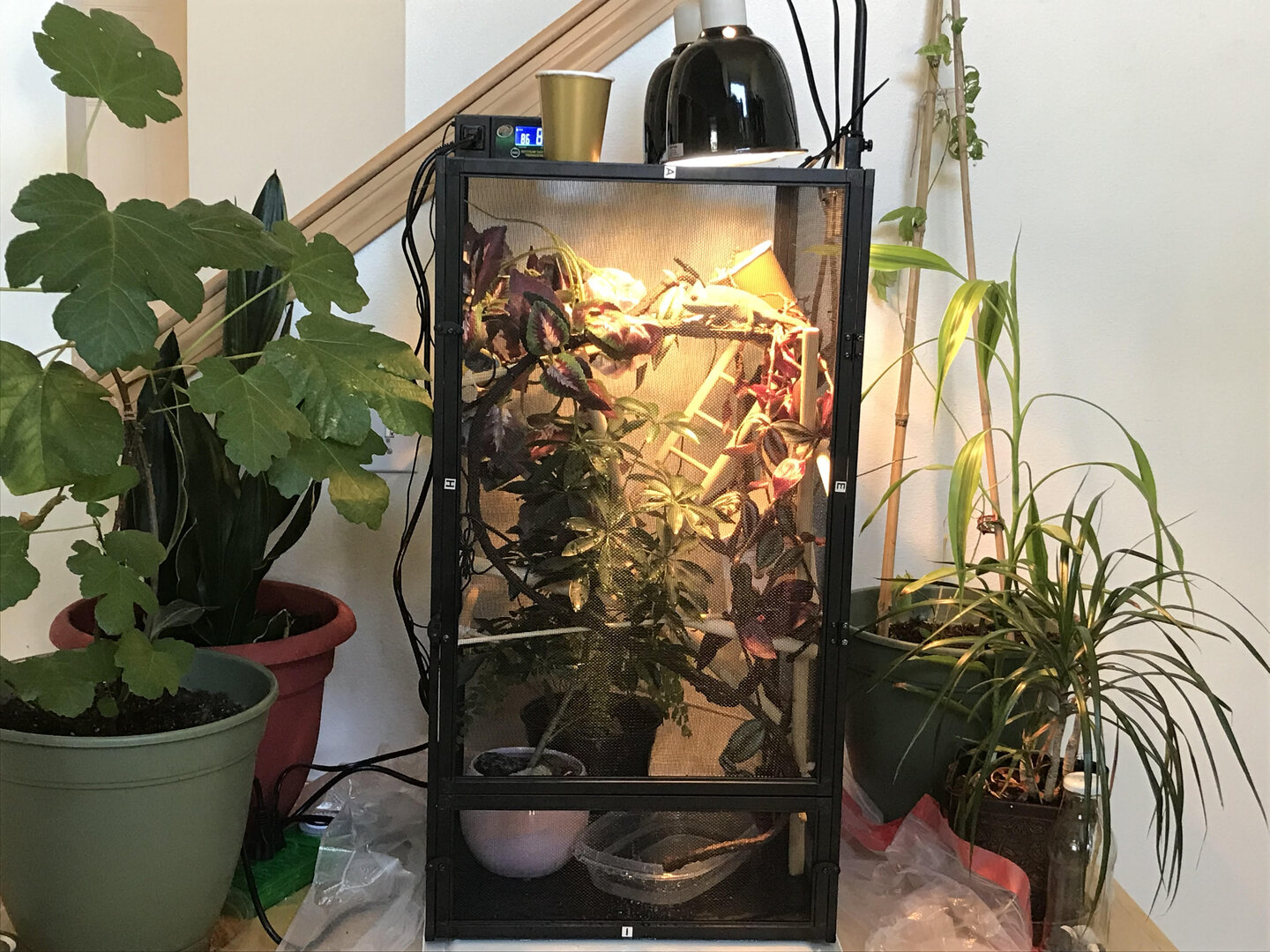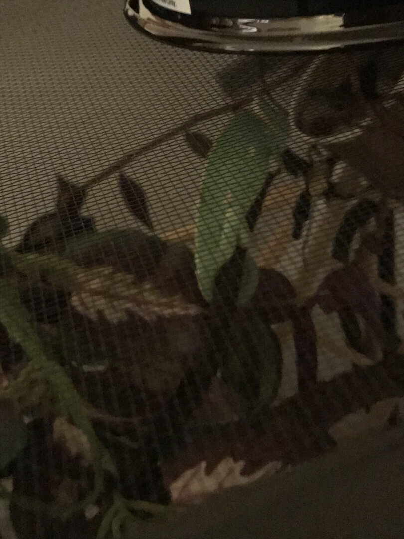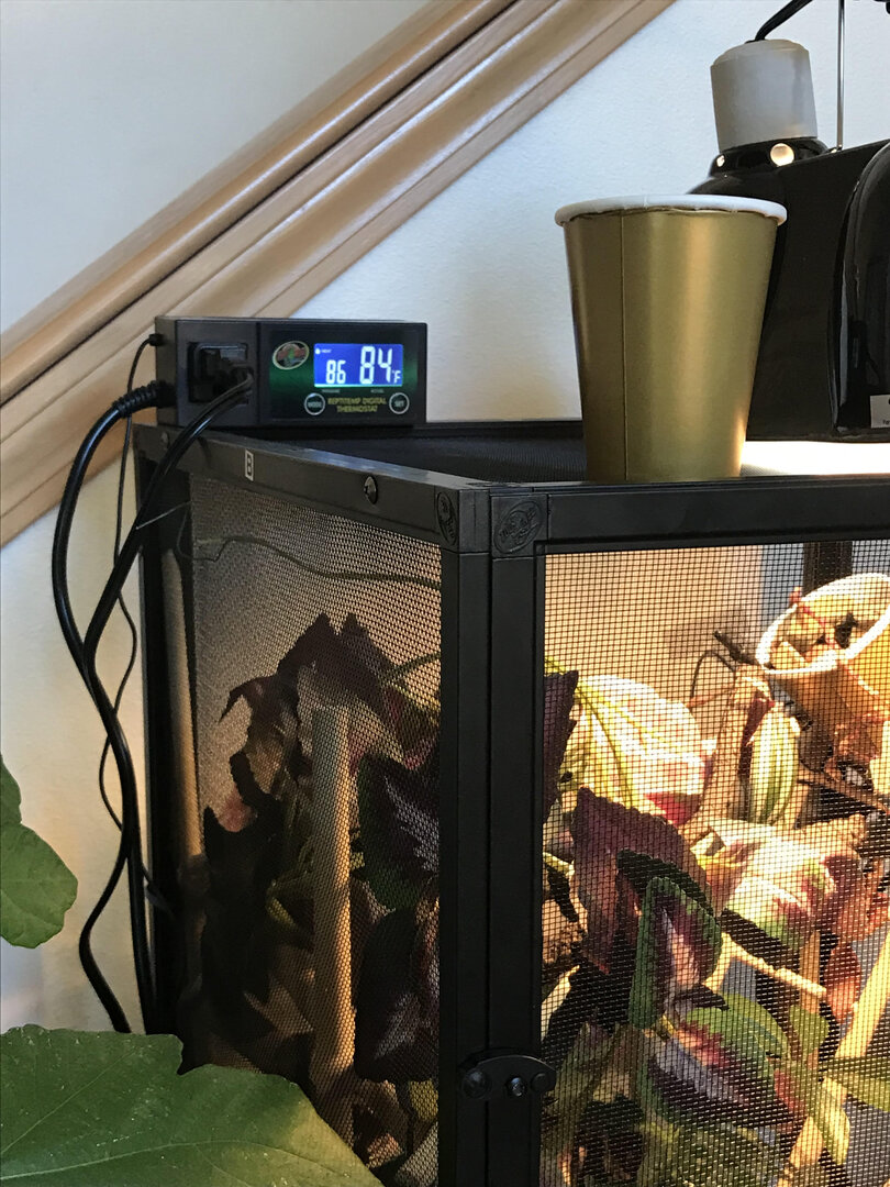 • Watering - I have a DIY dripper set up over one of her plants as well as misting in the morning, midday, and evening, but I’m worried she’s not getting enough water. I have seen her drink, but the heat lamps dry off the water quite quickly and the DIY dripper tends to pool on the screen and not actually drip through. At night I’m misting for about two minutes right before lights out. I am unsure if I should be using room-temp or warm water.