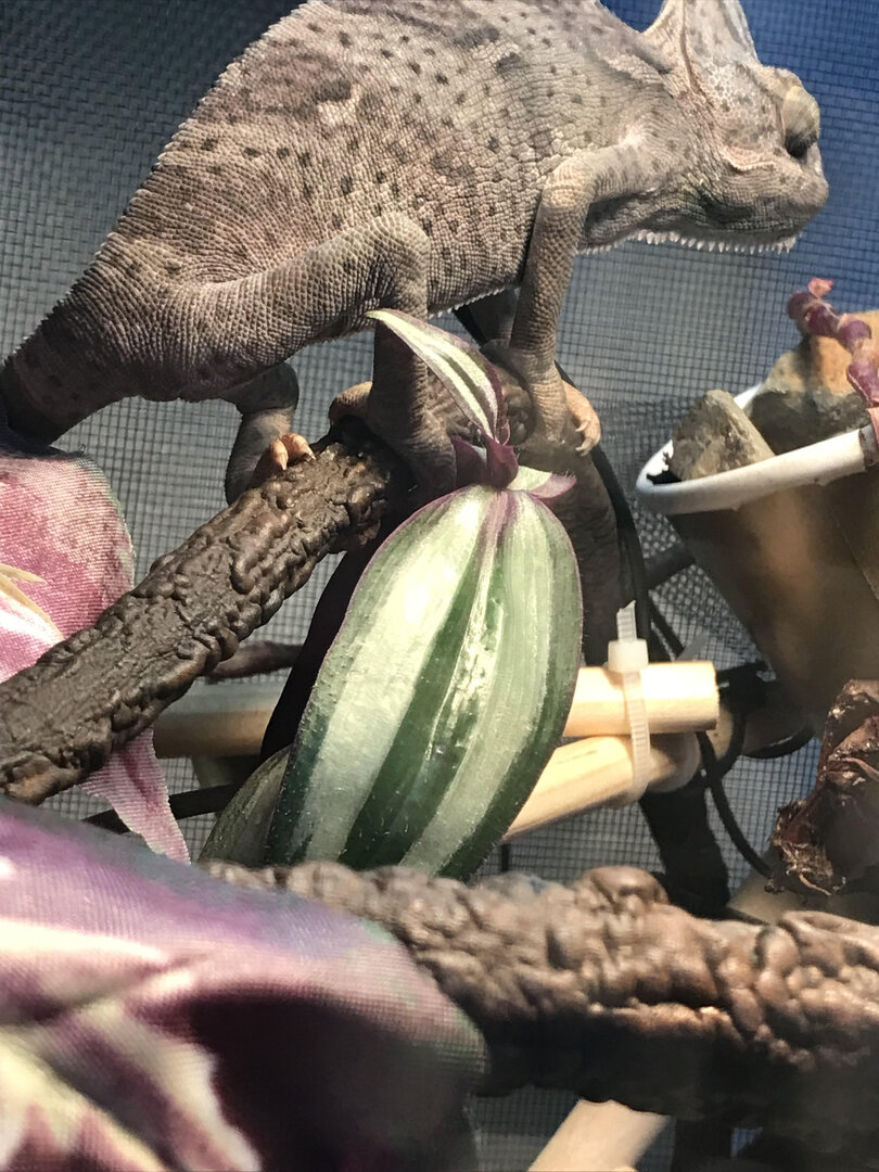 • Plants - One silk plant that we’re replacing soon, 1 wandering jew vine, 1 maidenhair fern, 1 schefflera. We have one spider plant and one Pothos that are going to replace the silk plant. Yes! All live and safe plants. I hang my fake ones on the outside door of my enclosures which gives my chams a little extra privacy. I’m guessing you’re using the safe plant list on CA.