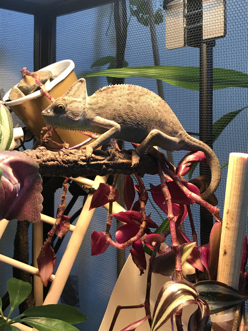 • Your Chameleon - Female (?) veiled chameleon - I don’t know how old she is, since she was a Petco rescue (oops), but she looks to be about in the 6-9 months range based on her length (5-7 in). This is the third day she’s been home.