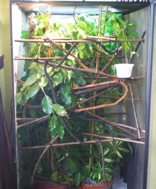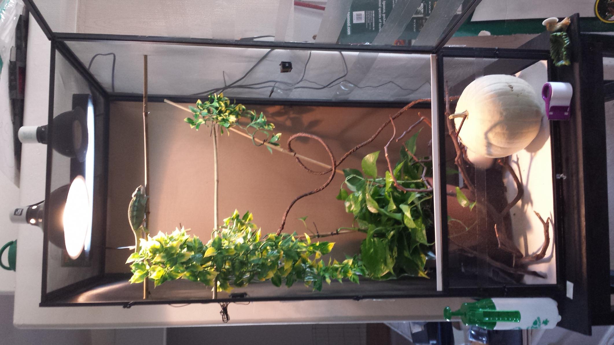 Hi so I am new to reptiles and just purchased a Panther chameleon 5 months old and just wanted to get some expert opinions on the equipment I am using and the setup I currently have. I have done hours of research into what is neccessary and think I have a fairly good perspective but am grateful for any critiques you have. Some general information I live in northern arizona so humidity is tough to keep high and summers are hot but winters can get very cold. It is currently set up in my living room and unfortunately we have no spare rooms to use and we have no low traffic areas to keep him in.