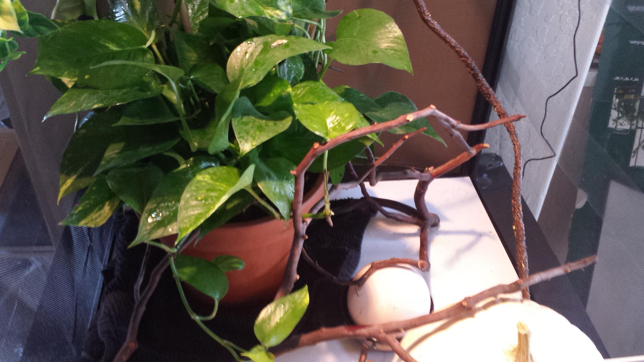 For the interior of the cage currently I have a pothos plant that is still growing and we have the vines growing up the sticks. Also we have 3 fake vine plants at 3 different corners connecting the various bamboo sticks that allow our chameleon to access the different heights and corners of the cage. Two of the bamboo sticks are horizontal and are the primary basking spot for our chameleon. The bottom of the cage is bare except some fake branches and my wife insisted on a pumpkin(for halloween).
