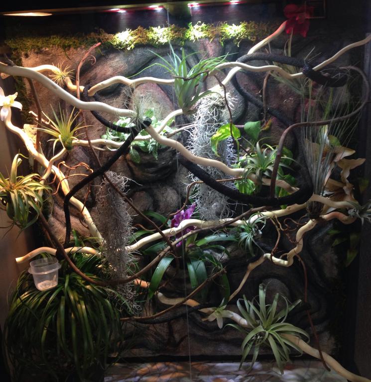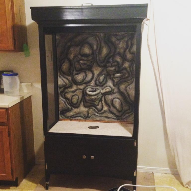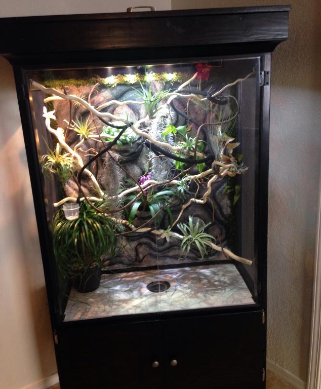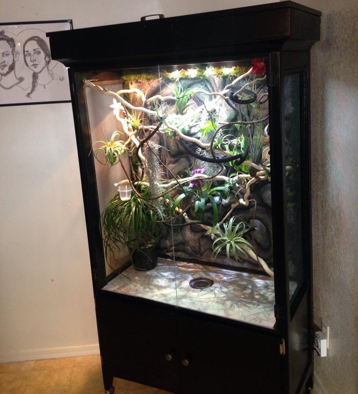 hello everyone, long time lurker, but new poster. I have been working on this enclosure for several months and finally finished it up this weekend and just wanted to share it. I converted it from a dresser/entertainment stand. It is aluminum screening on both sides and top, custom background and glass doors. if you have any questions let me know :) enjoy!
