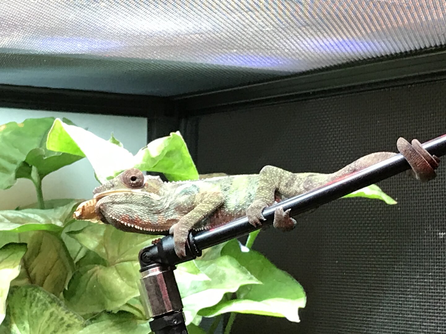 Your fine. I appreciate the interest. I worked hard on it and I have never been one to not like sharing info. So Beman cup feeds or hand feeds. I just take it to him and he takes the feeders right down. Since he is full grown he is on a reduced feeding plan so I do not need a permanent feeder run for him but he does have a small cup that I made that hooks to a dragon ledge. But I also have the shooting gallery large feeder for the baby I will be getting. I love it. https://tkchameleons.com/Where do you have your feeder and what are you using. Sorry but you’re setup is great and I’m looking to rework mine a bit lol