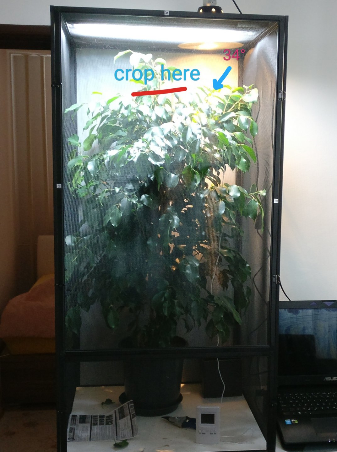 I NEED ADVICE from you guys about my ficus tree. Should i leave it as it is, so my cham can climb almost right under lights? Or should i crop that two tallestbranches? I am planing to make some basking branches at hight of that basking spot (where you can see 34 degrees on pic).
