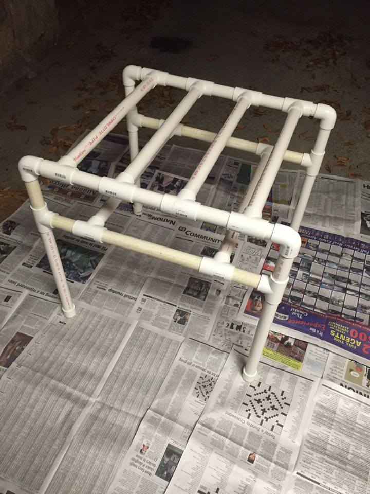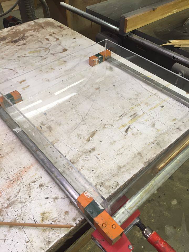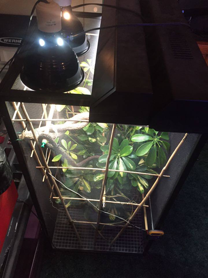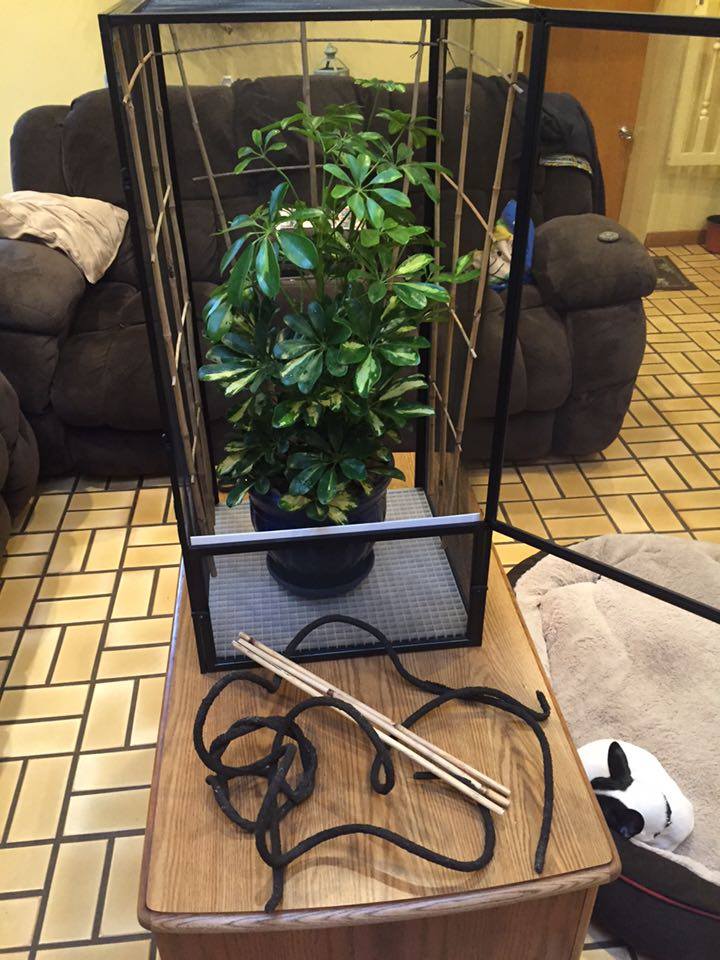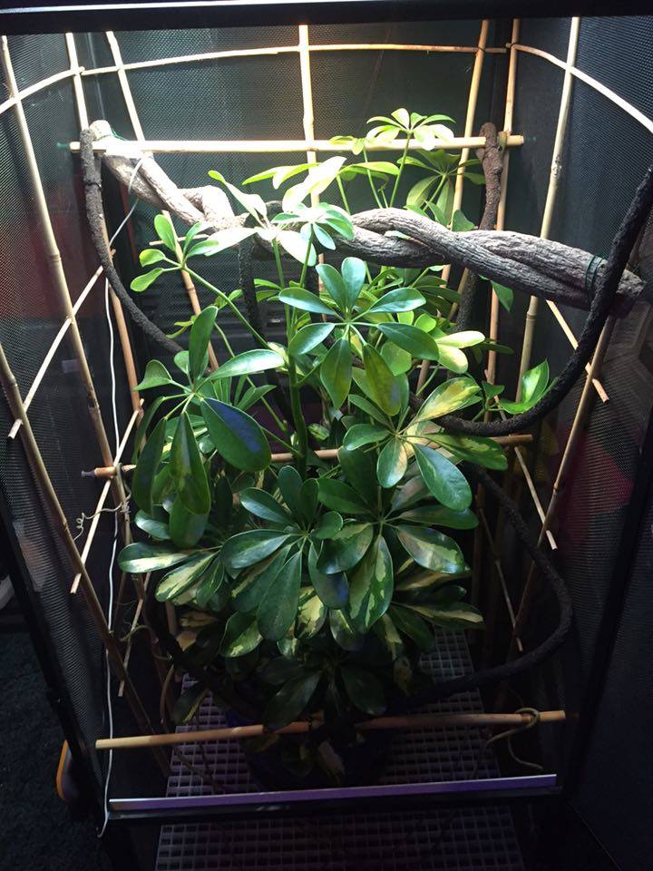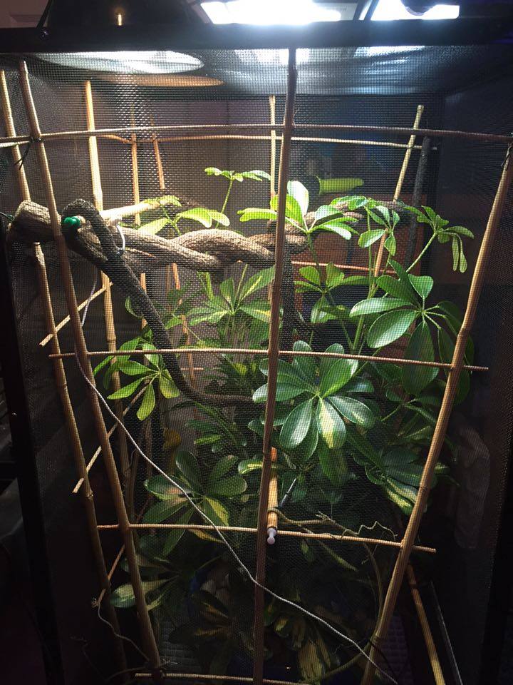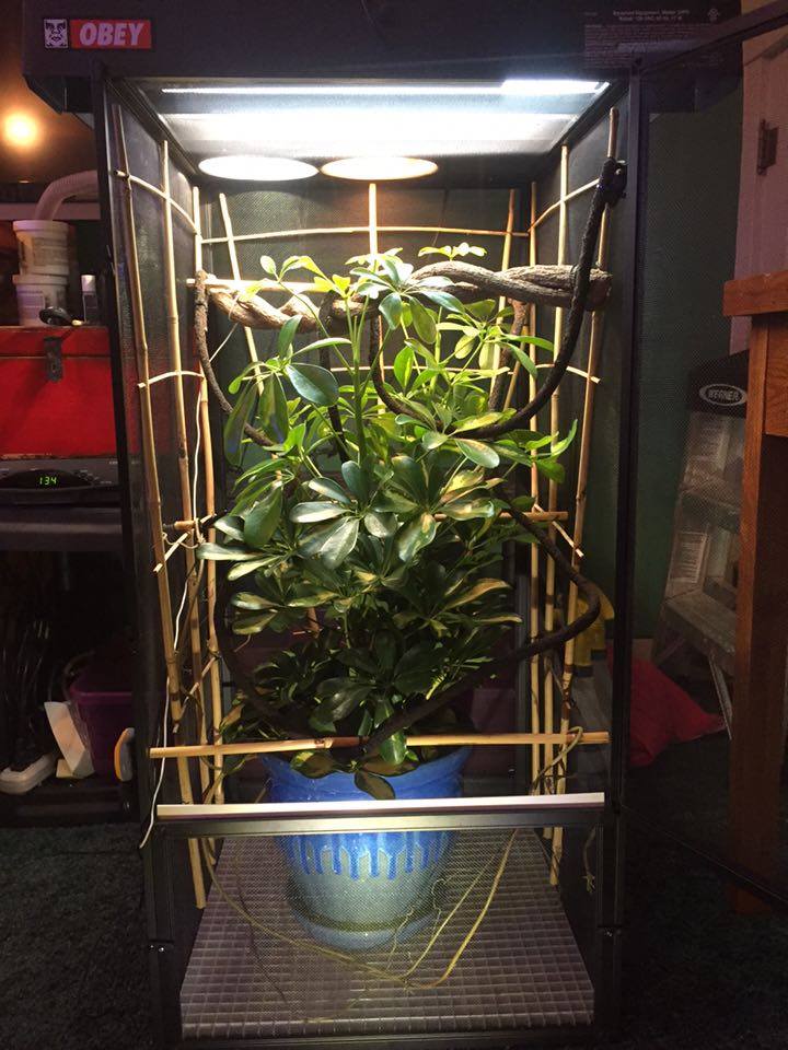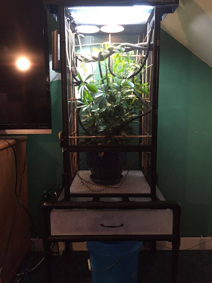 The center piece is a dwarf umbrella (schefflear arboricola) I found at home depot.. Gave it a good warm shower.. Washed all the dirt from the roots... Re potted it in organic soil.. and put large cleaned river rocks at the top of the pot.. I found bamboo lattice at a locale florist shop and attached it to three sides of the enclosure hopefully to promote using it for climbing instead of the screen... I used more bamboo for different levels of perches and then a few different styles of store bought fake vines to fill it out... Lighting wise i have two t8 fixtures one with a reptisun and the other with a 5000k plant growing bulb.. Along with two 5.5 in domes in the back for a basking spot... One has a 100 watt bulb and the other has a 50 watt... I have two digital thermometers with probes (plans to buy a heat gun)... One set 6in from the basking spot that reads 85 degrees and one about half way down that shows 73 degrees... Room Temperature of the house is set at 65 degrees... I have my old auto mister (reptirain) set up on it now... Set to mist every 3 hours for 60 seconds... Plus I hand mist about twice a day... Humidity spikes to 80+ when misted and drop to 40s otherwise... I did ordered a Mistking a few days ago and I'm pretty excited for it to show up... I designed and made my own stand out of 1in PVC pipe and fittings... For drainage i replaced the bottom of the reptibreeze with a grid of plastic used for large scale lighting... The open bottom allows everything that falls from above to be collected in a drip pan... I made the drip pan out of a sheet of 1/4 in acrylic... Glued it together and used an aquarium silicone to make it water tight... Sanded it all to give it that frosted look and add handles to the front and back... To give it a drawer appearance and make it easier to carry and dump...