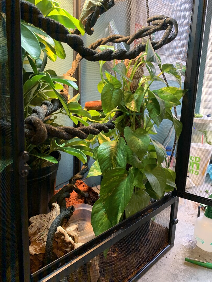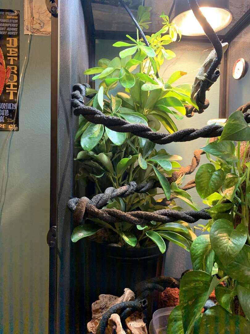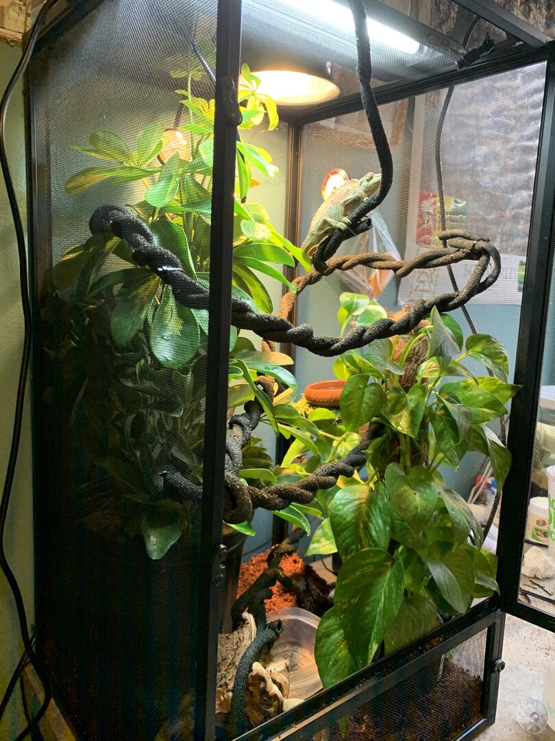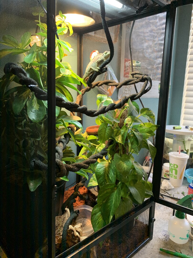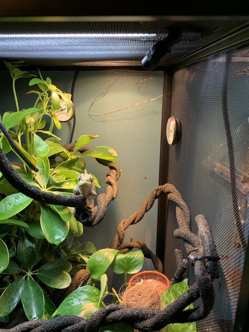 inside the cage we have coconut bedding, might have to put a lay bin down she possibly could have eggs. there’s then 2 live plants. a gold capella schefflera (arbicola) and a golden pothos. they were both replanted into her coconut bedding and all fertilizer was completely washed from the roots, leafs and pots. on top of the coconut in the pots i washed rocks and covered all exposed substrate. they take up most of the tank but i think she likes that!! i have twisted together my jungle vine so it’s more stable for her, the vine has areas that feed through plants for dense hiding spots, as well as come right through the middle so she can bask when feels necessary. i also have the solo monsoon set up. she does NOT like when the mister sprays her, so im also trying to find a position that acts more as rain - that’s a working progress. i’m now figuring out the best cycle. right now i’m on 8 seconds of spray every hour, please let me know if you have tried other cycles and have success. i’m also thinking my temp & humidity gages were thrown off by the move because neither seem to be right, so if anyone has recommendations for those that would be appreciated. she’s been through quite a lot in the past week, leaving the pet store, going to the vet, getting changed into another tank etc. so i’m planning to leave her entirely for a week, once that’s up start hand feeding to build trust (i’m gonna have to get over the worms being on my hand lol). so far, pretty good. i’m brand new to chameleons, and to be completely honest, reptiles in general. i know that’s not recommended however i have a bunch of people giving me pointers and marley seems to be happy exploring her new home. at this point my main goal is to have her more comfortable with my hands. she’s very timid, won’t bite or even puff out, but very clearly upset with being bothered. chameleons obviously aren’t going to jump right into your hand, just wanting that mutual trust to make everyday tasks a little less stressful. any and all feedback is greatly appreciated.