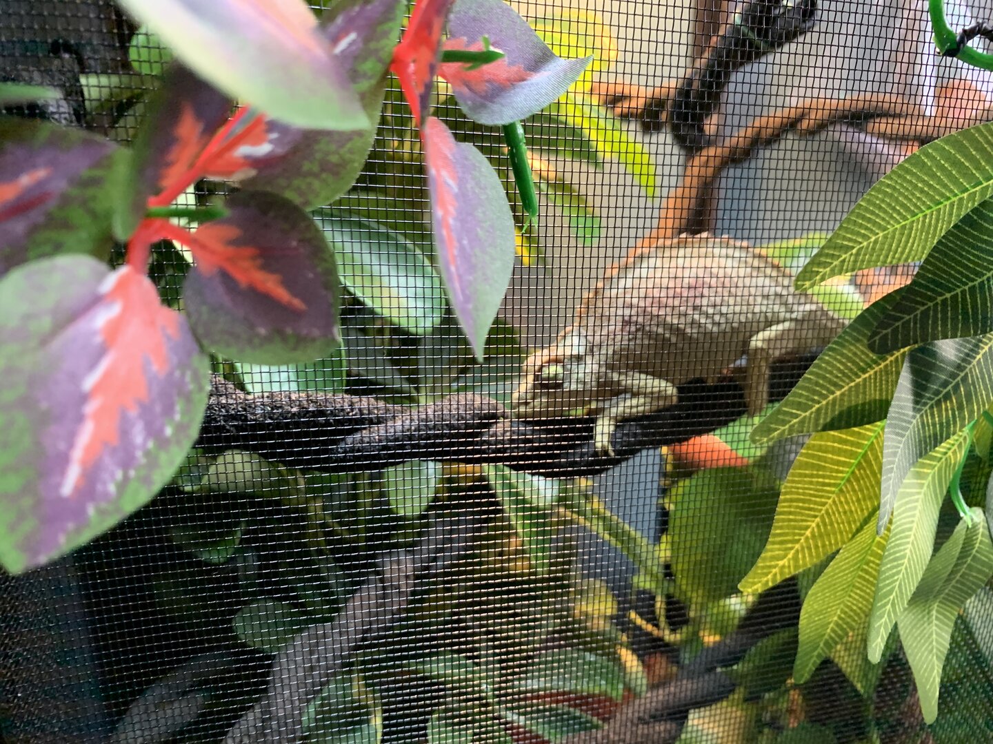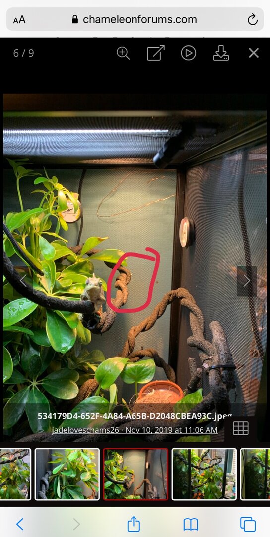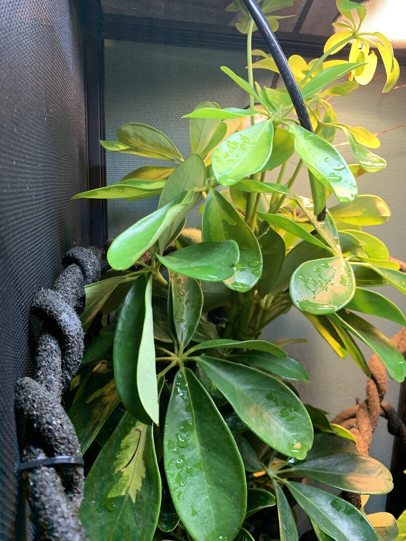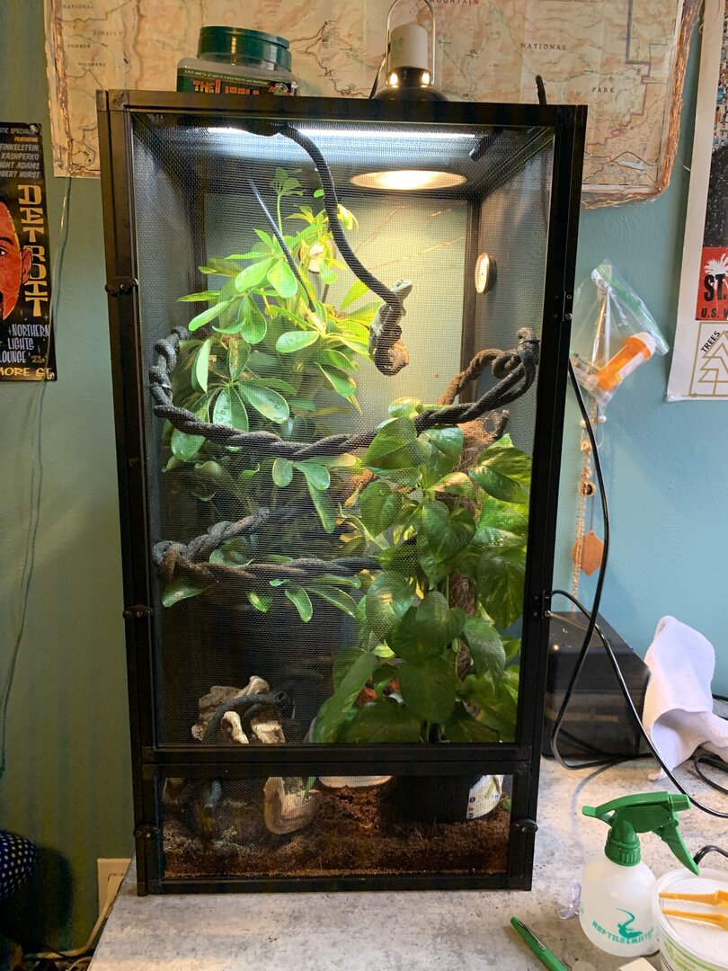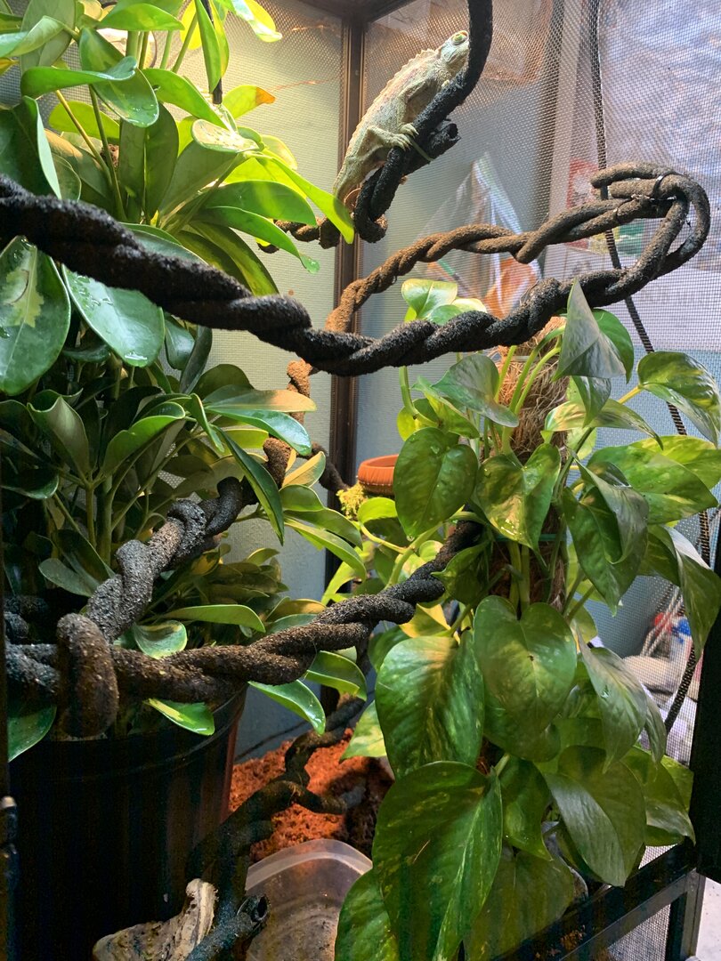 inside the cage we have coconut bedding, might have to put a lay bin down she possibly could have eggs. there’s then 2 live plants. a gold capella schefflera (arbicola) and a golden pothos. they were both replanted into her coconut bedding and all fertilizer was completely washed from the roots, leafs and pots. on top of the coconut in the pots i washed rocks and covered all exposed substrate. they take up most of the tank but i think she likes that!! i have twisted together my jungle vine so it’s more stable for her, the vine has areas that feed through plants for dense hiding spots, as well as come right through the middle so she can bask when feels necessary. i also have the solo monsoon set up. she does NOT like when the mister sprays her, so im also trying to find a position that acts more as rain - that’s a working progress. i’m now figuring out the best cycle. right now i’m on 8 seconds of spray every hour, please let me know if you have tried other cycles and have success. i’m also thinking my temp & humidity gages were thrown off by the move because neither seem to be right, so if anyone has recommendations for those that would be appreciated. she’s been through quite a lot in the past week, leaving the pet store, going to the vet, getting changed into another tank etc. so i’m planning to leave her entirely for a week, once that’s up start hand feeding to build trust (i’m gonna have to get over the worms being on my hand lol). so far, pretty good. i’m brand new to chameleons, and to be completely honest, reptiles in general. i know that’s not recommended however i have a bunch of people giving me pointers and marley seems to be happy exploring her new home. at this point my main goal is to have her more comfortable with my hands. she’s very timid, won’t bite or even puff out, but very clearly upset with being bothered. chameleons obviously aren’t going to jump right into your hand, just wanting that mutual trust to make everyday tasks a little less stressful. any and all feedback is greatly appreciated.