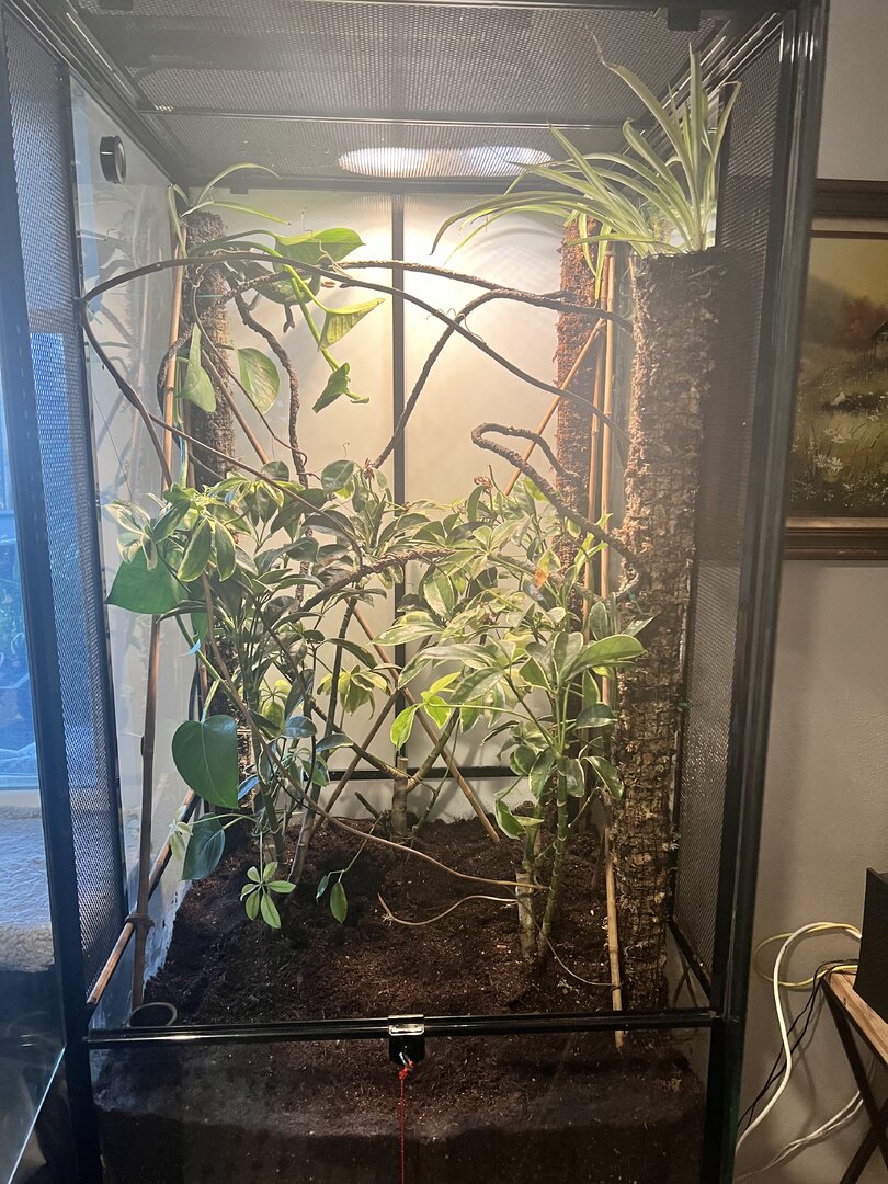 Finally got this set up enough for him to move in this evening. 2’x2’x4’ hybrid cage. Going to try bioactive, hope it works out. Got about 8” of soil (sand, coco fiber, top soil, worm castings, peat moss, carbon) on top of 1 1/2- 2” of ceramic balls. I did three 4’ tall sphagnim moss poles (wire rolled about a baseball size round filled with moss), these acts as my anchors for fake vines, give something for pothos and spider plants to grow into and on, and hoping they will help me maintain humidity. Bamboo scaffolding to add stability to poles and to attach future foliage to. Still need to get some isopods and springtails, to make it come to life.