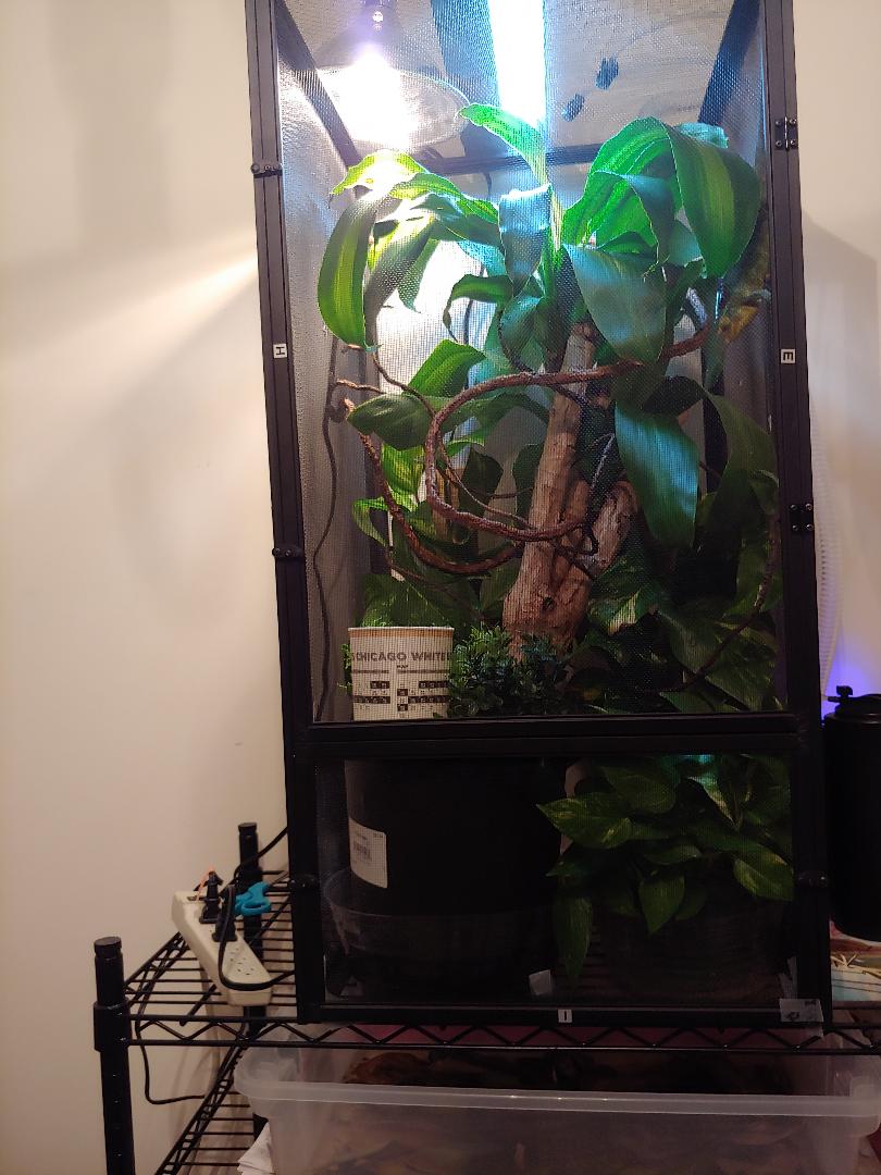 - Humidity - Misting (Every hour for 45 seconds) and fogger (runs all day and night) help keep up humidity. Stays around 60-70% in non-basking spots.