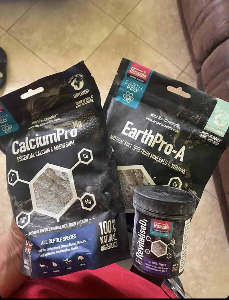 • Feeding - right now he’s eating just crickets Cut load with Flukers cricket feed, ordered Arcadia Reptile Small Bundle - 100g EarthPro-A, 80g CalciumPro+Mg and Repashy bug burger