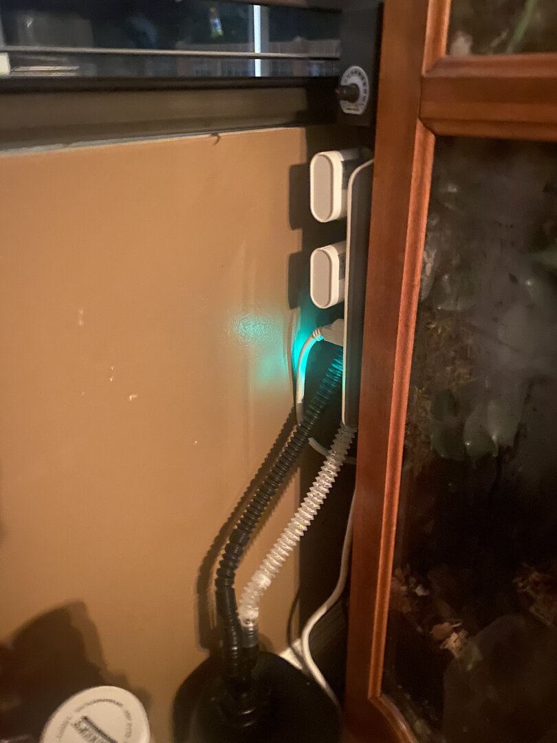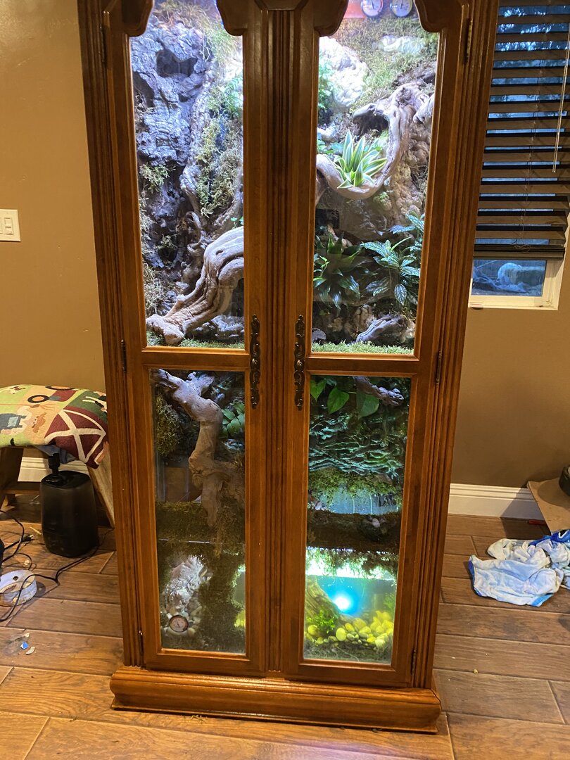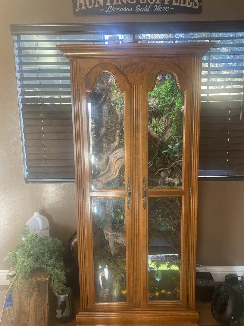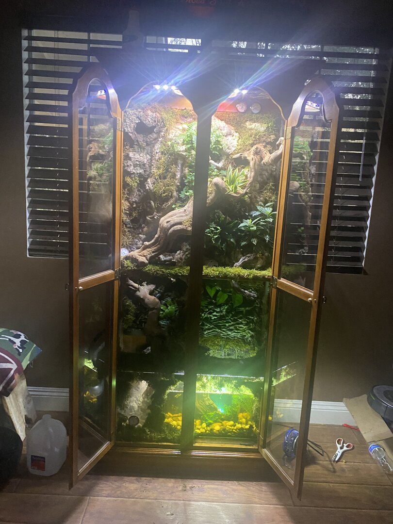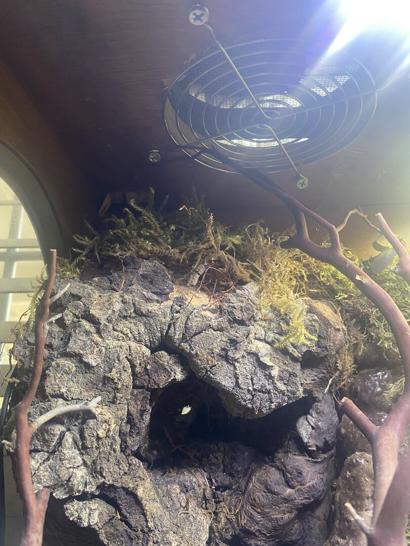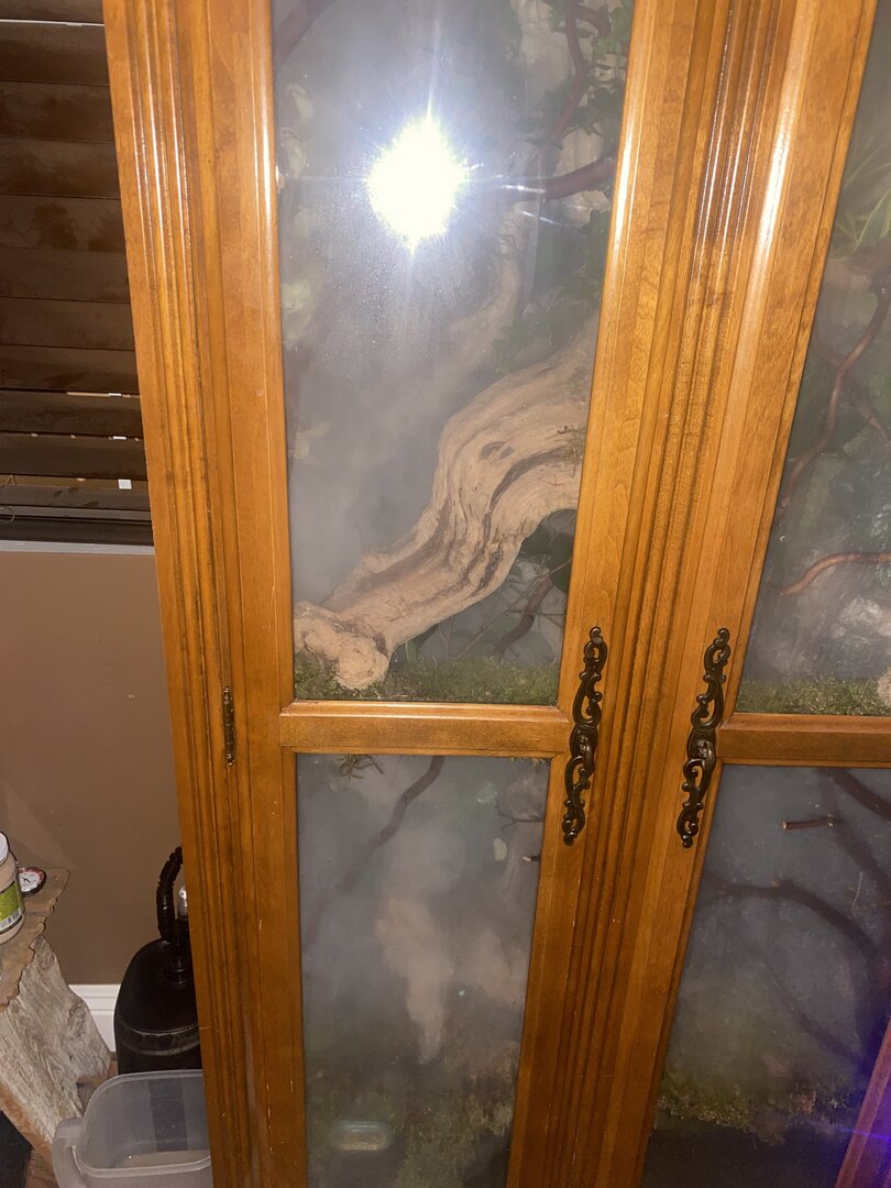 • Cage Type - homemade custom Glass and wood exhaust and supply fan on top . Reptile daylight LED , twin dome heat 5.0 UVB Acadia . 16x36x72 slot vent in bottom of door to create chimney effect when exhaust fans on above.