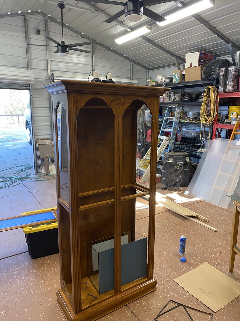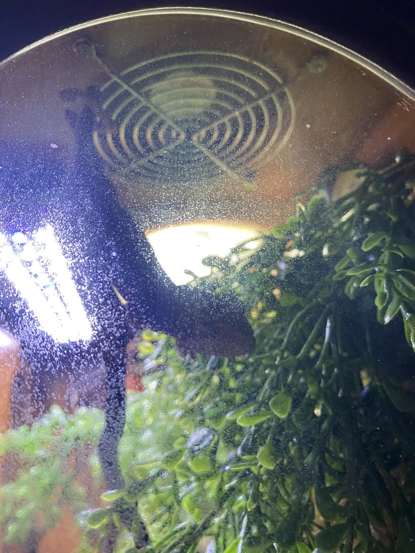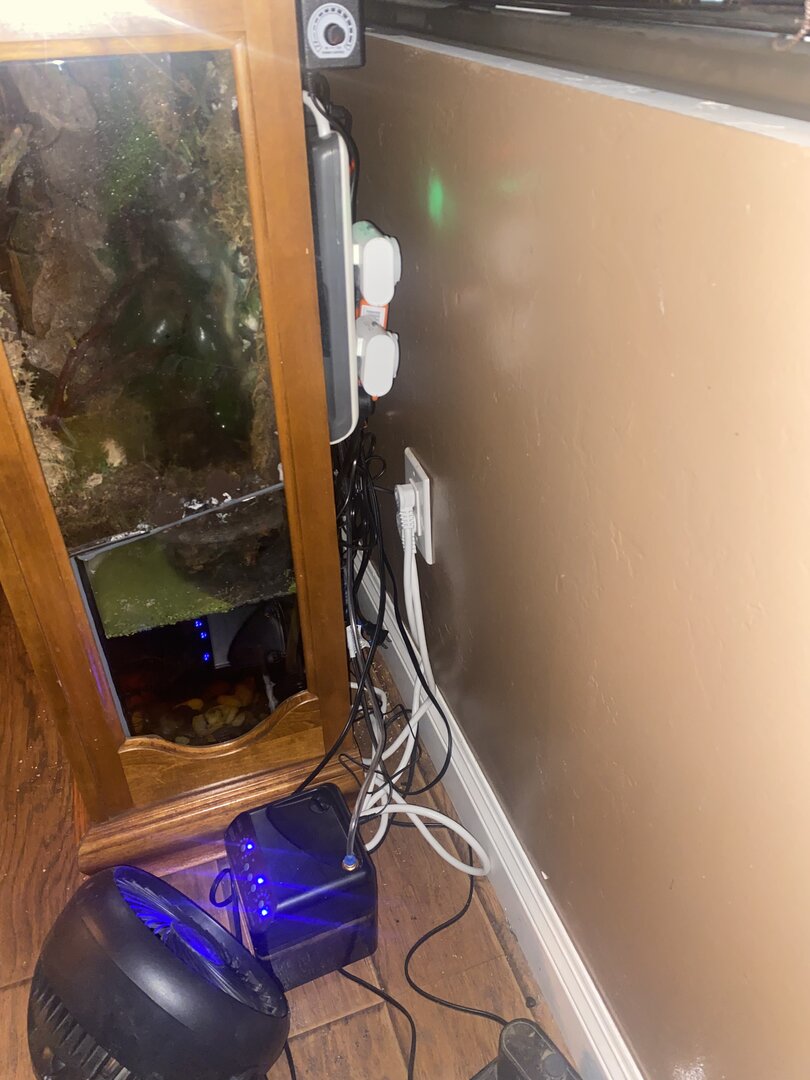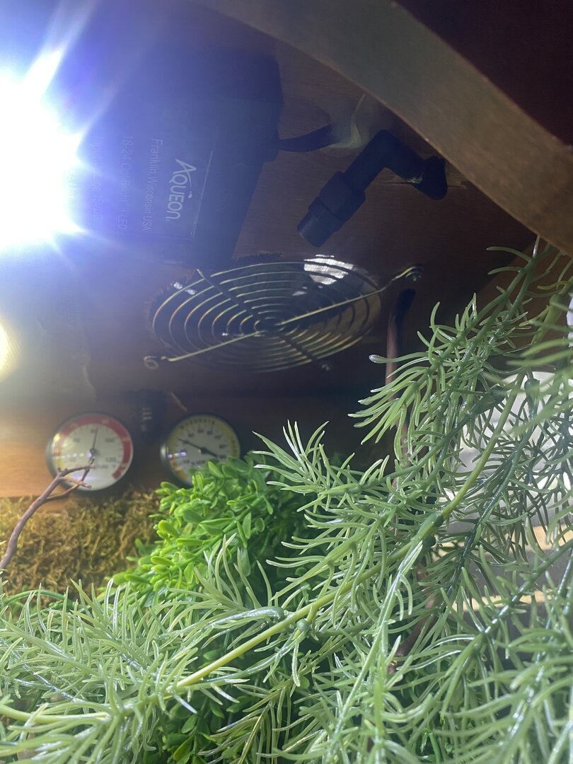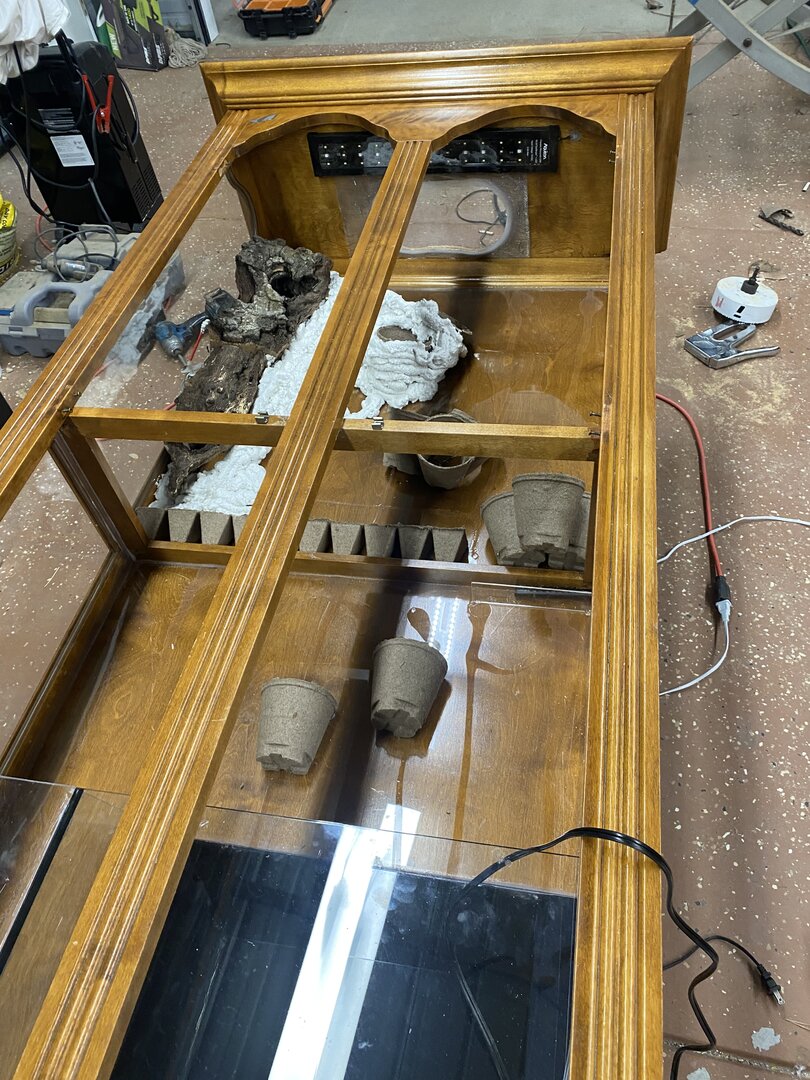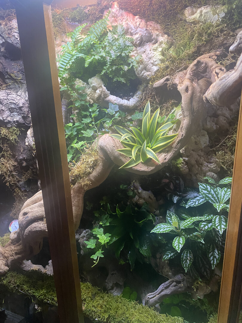 • Cage Type - homemade custom Glass and wood exhaust and supply fan on top . Reptile daylight LED , twin dome heat 5.0 UVB Acadia . 16x36x72 slot vent in bottom of door to create chimney effect when exhaust fans on above.