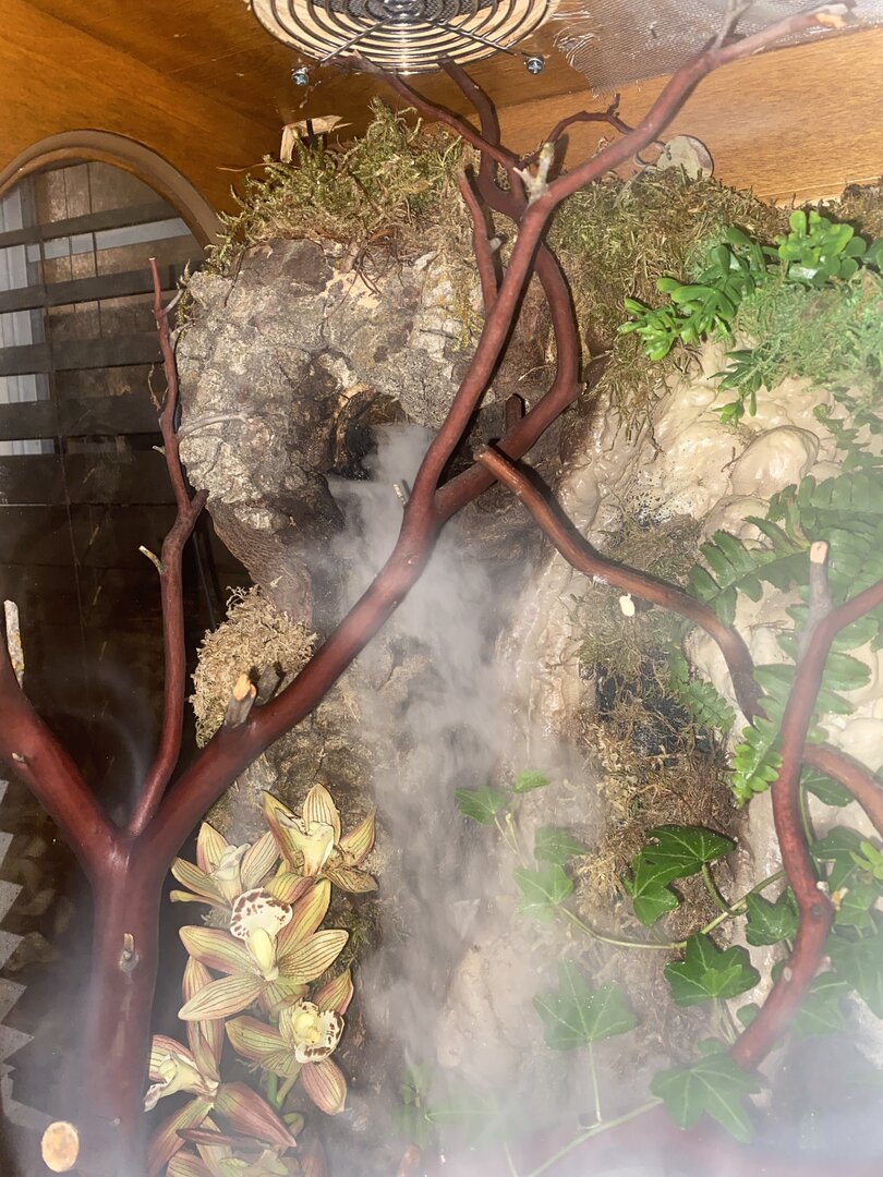 • Watering - using the misting system and fogger Per Chamaeleon Academy , fogger 1 am to 5 off misting System one time a day around six , no he have not seen him drink appears to be very well hydrated
