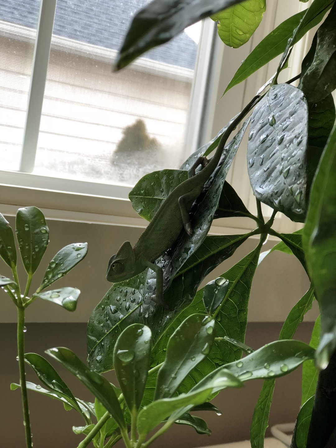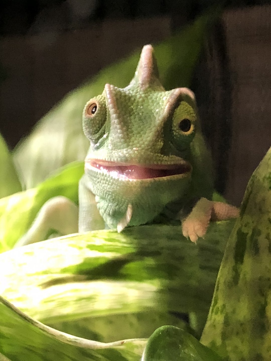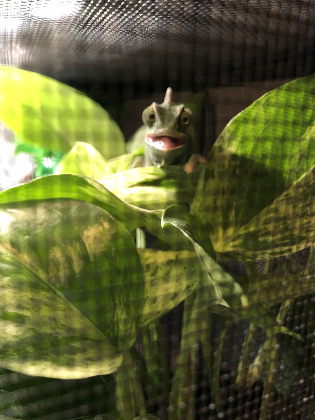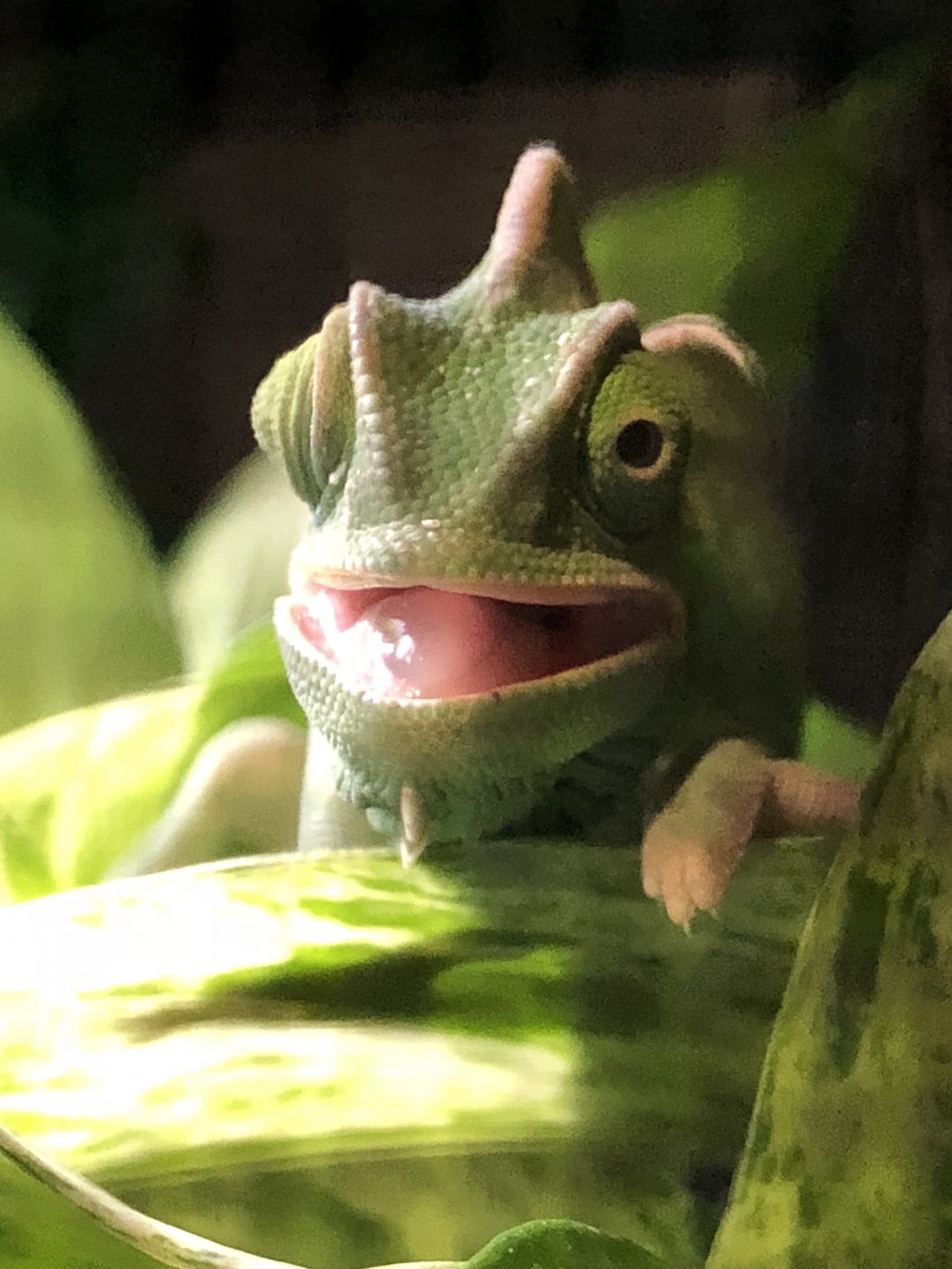 Hello! I’m a new mom to two baby veileds. My husband and I bought a male and female at Repticon a week and a half ago. I’ve no idea of age, but people have guesstimated 3months or so. I’ve just moved the male into a new enclosure as he seems cool as a cucumber, whereas my girl is quite skiddish. In both cages I’ve noticed him chilling on his branches with his mouth open (within 7-8” of both/either his Reptisun compact 5.0 bulb or heat lamp).
