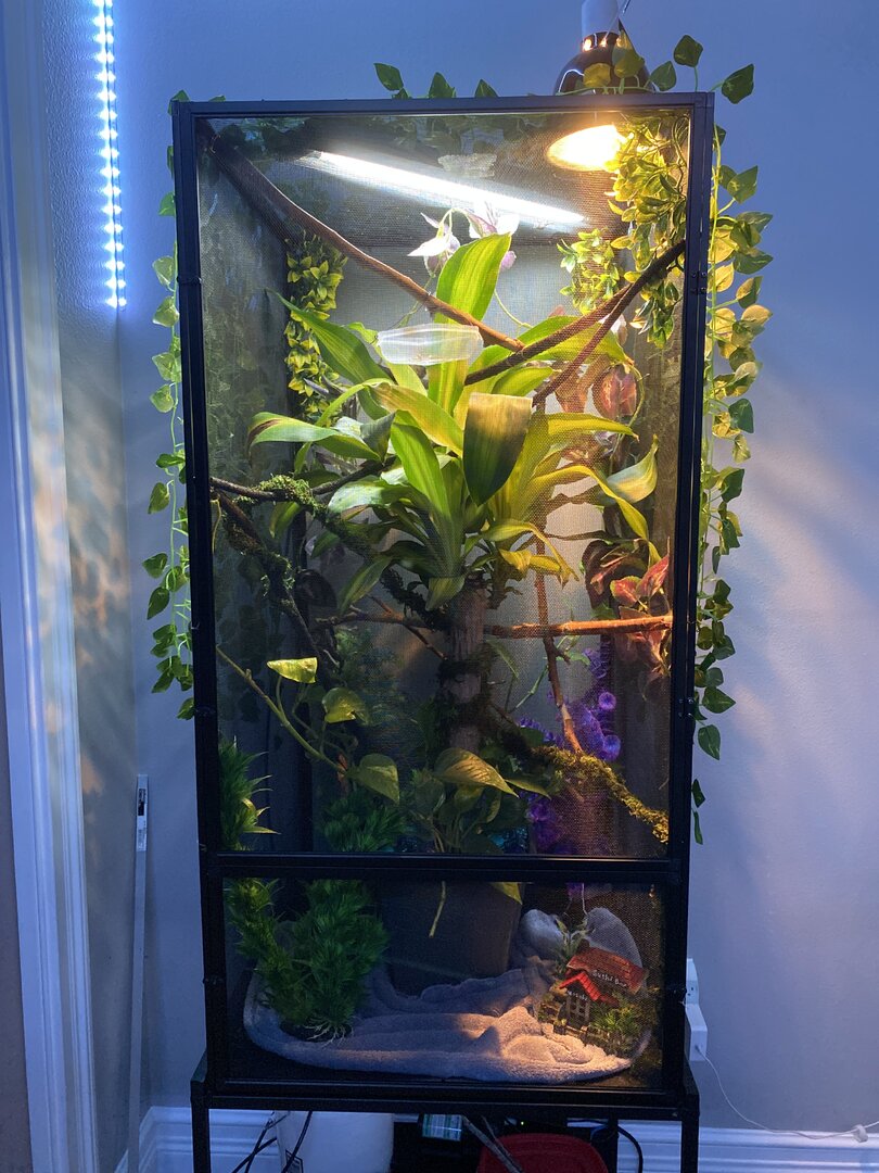 Set up looks pretty good but that is a very small chameleon...how old did they say it was? You will probably need to raise the lights off too. What are your temps? IMO you need to get fruit flies and some pin head crickets for feeders. Also, you want to watch the supplementing. By just the look of it being so small you don’t want to over supplement. You might need to put it in a smaller enclosure. Hopefully more members will chime in. @kinyonga @Beman @Hashtag ChamLife @Redman