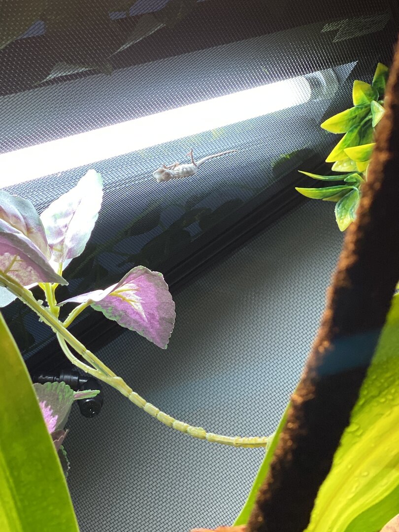 He also has not basked at all, as soon as I put him in the cage yesterday he hung underneath the uvb light and shed then went and hid in the plant that I have hanging in the corner, he’s been there since. I have a mistking and I’ve seen him drink off the leaves but I really need some advice about the feeding and why he’s not basking at all.