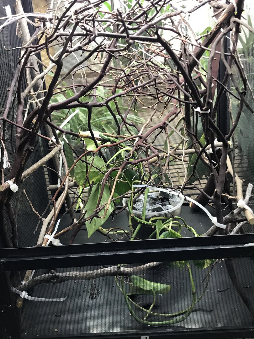 I was thinking about just putting this little cage into the big one, then it’ll get the light and the misting schedule still. Okay, right before I turned his lights off he was not having it lolI think that looks good, do you know how you will situate the lights?