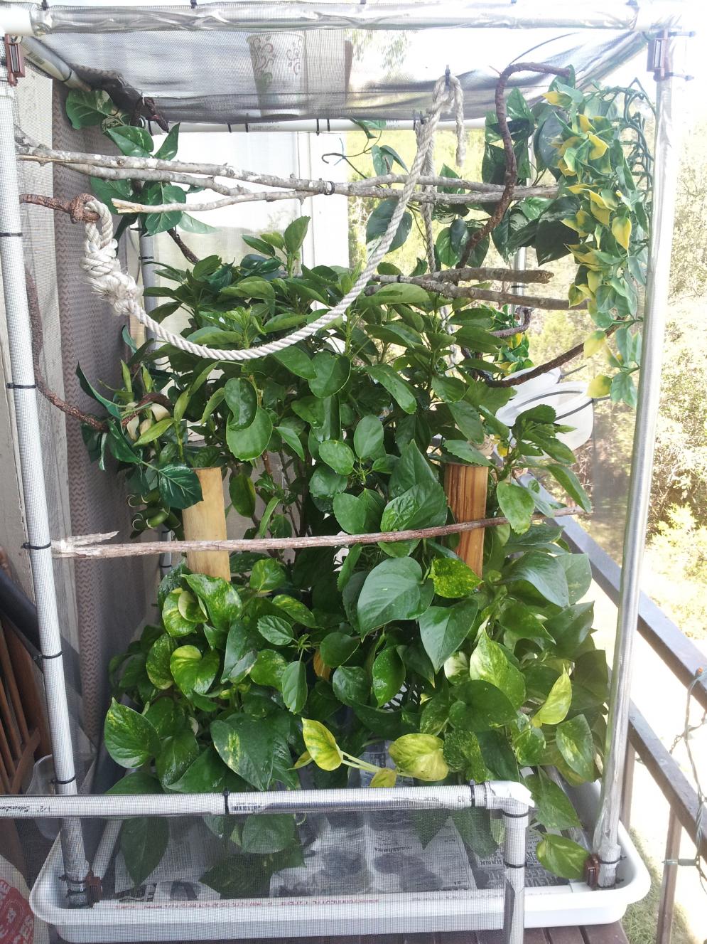 Mostly PVC and zip tied. I have a large hibiscus plant as the main and two growing pothos towards the bottom. Some vines and branches. I have added several more horizontal branches since taking the pics. I mist 4-5 times a day and use ice to drip 2-3 times a day at the same times as misting. He gets direct morning sun for about 4 hours and the rest is in shade. I live in central Texas and it gets hot but he seems fine and not bothered at all. Day temps are around 95+ but he is in complete shade at these times. His cage is around 90 towards the top and 83-85 at the middle and bottom. His sleeping temps are around 75-85. He tends to get in the sun in the mornings and stay in the middle during the day then back to the top at night. He is eating fine and drinking plenty.