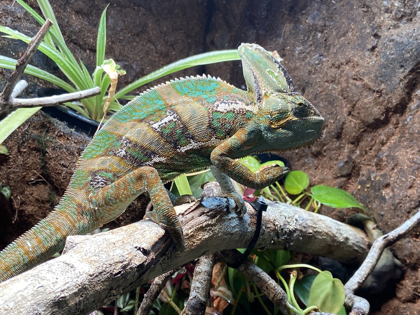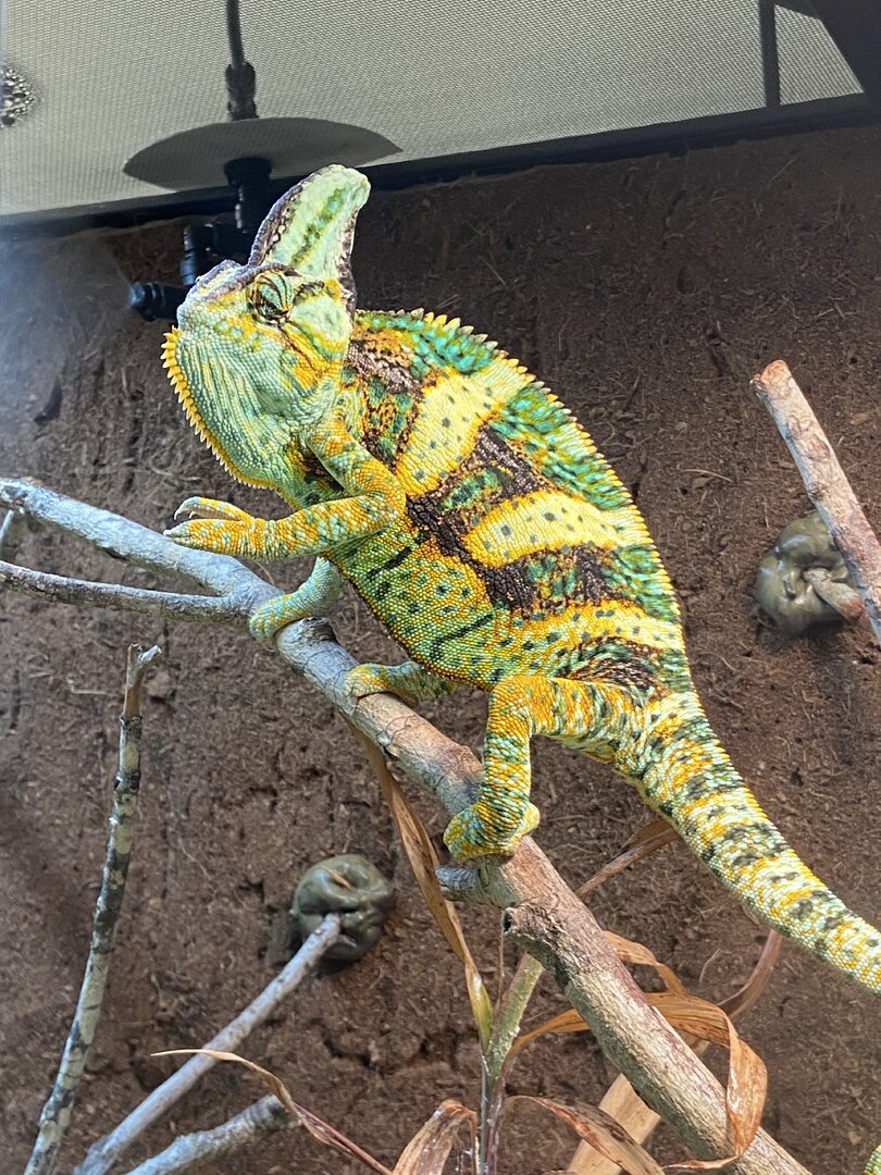 My wife recieved a juvenile male for Christmas. We have him in a 45 gallon tank with plants, vines, and logs to climb on. During the day, we use a 65 watt heat lamp, USB light, and a light strip. At night, we have a 100 wat ceramic heat lamp for him. We have a misting system and a drip waterer. Although I have only seen him eat one cricket, they seem to be disappearing from the tank. The floor is a reptile substrate. While sleeping, he turns a light green with yellow stripes. In the day, he's a dusty gray with some rust color. I'm worried about him. Any advice is appreciated.