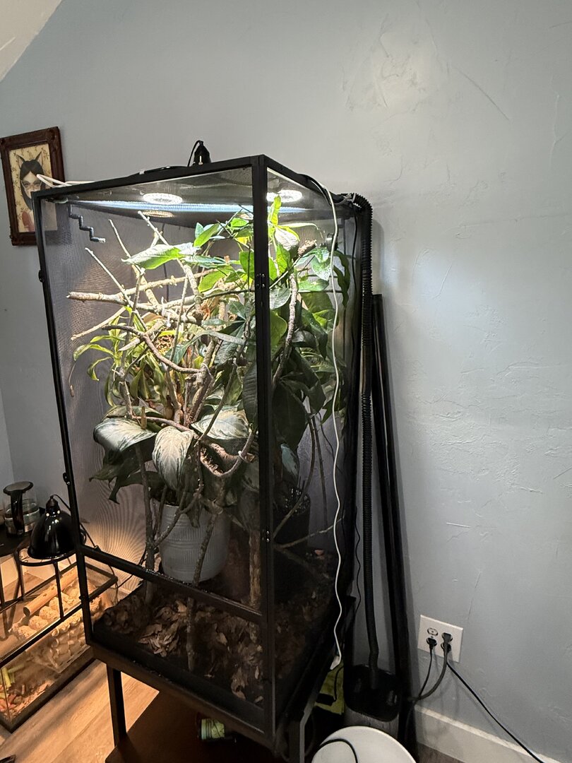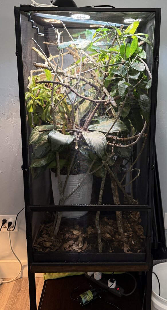 - Watering - Fogger at night, mister 7 minutes at night, no real schedule other than that - *I need help here* - I have only seen him drink one time and that was first day